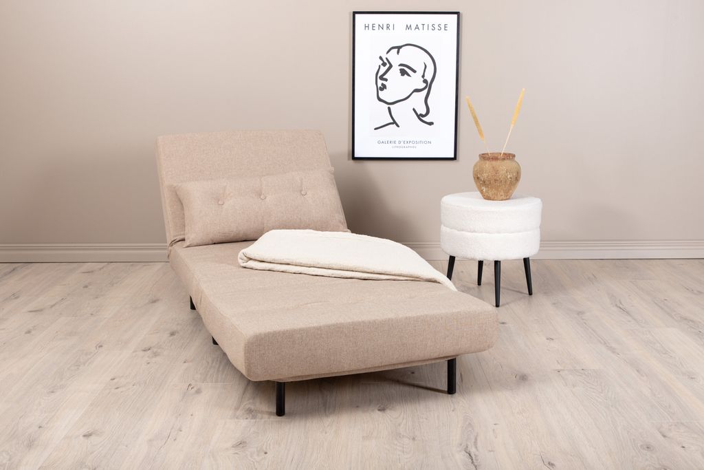Stilren bäddsoffa i beige polyester som enkelt förvandlas till schäslong eller enkelsäng för maximal komfort.