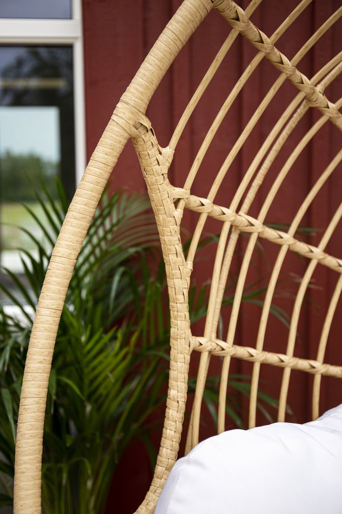 Trendig och bekväm hängstol i naturfärgad konstrotting med vita kuddar. Perfekt för uteplatsen.