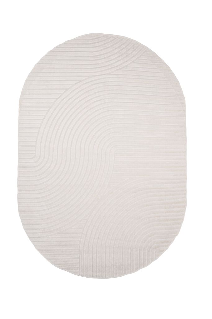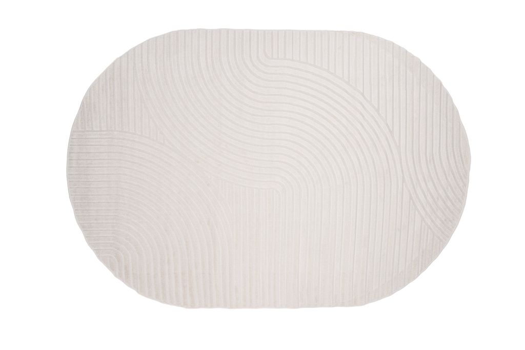 Modern oval matta i krämvitt med abstrakt mönster. Mjuk och stilren, perfekt för alla inredningar.