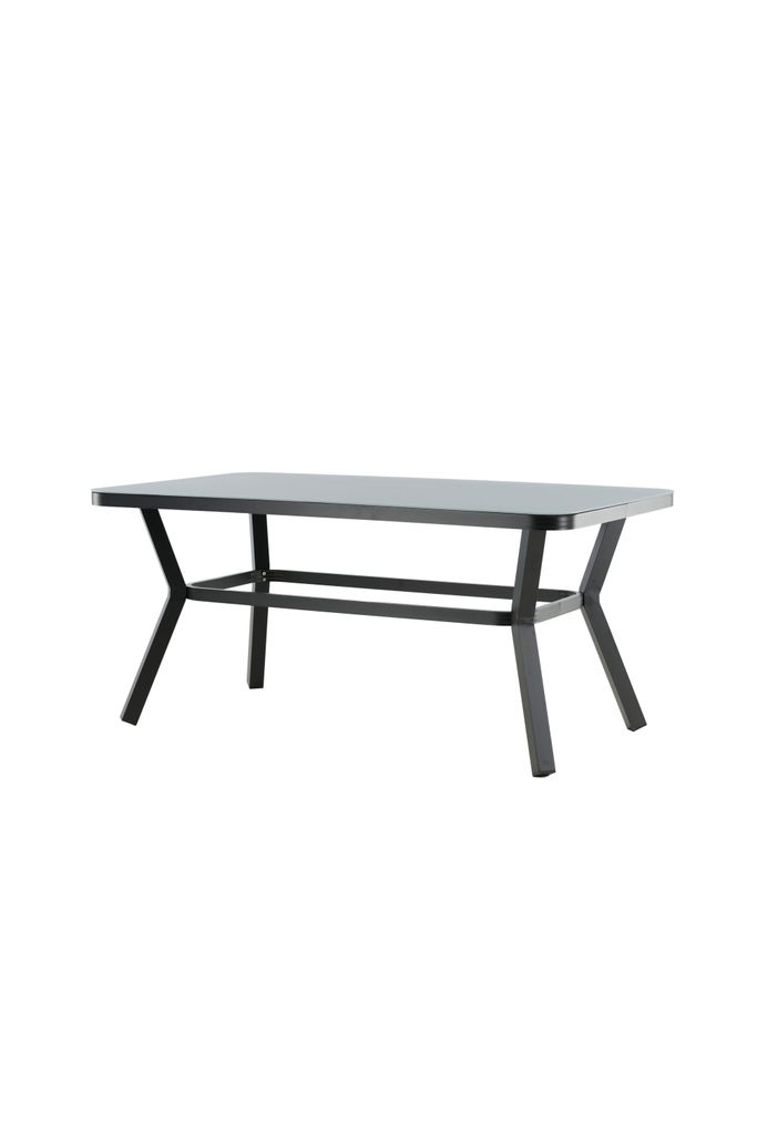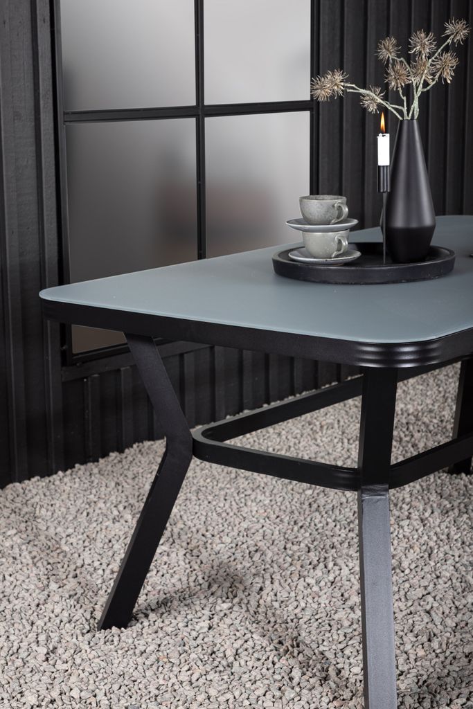 Elegant matbord med glasbordsskiva och svarta aluminiumben. Perfekt för både altan och trädgård.