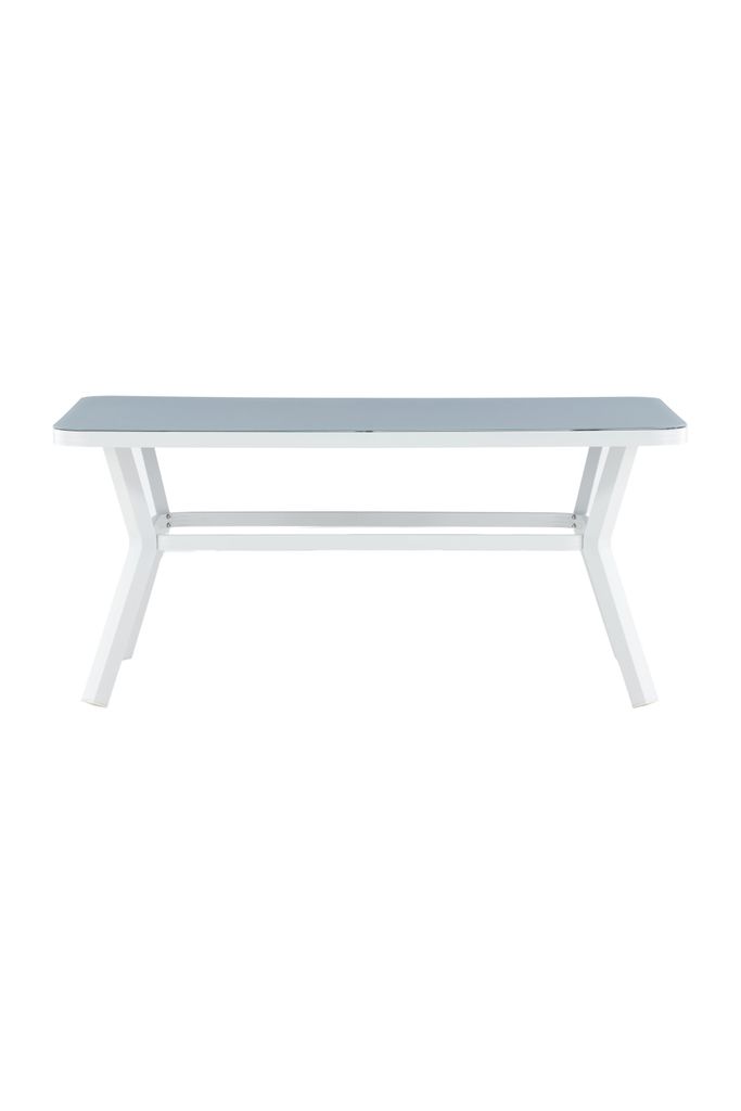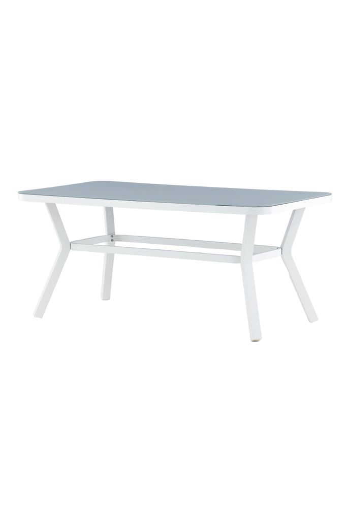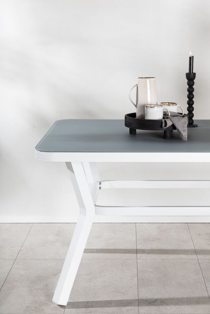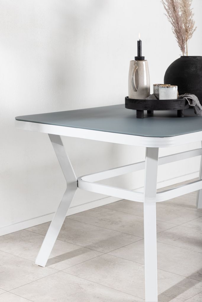 Bordets grå glasbordsskiva är både stilfull och lätt att rengöra, vilket gör det till ett praktiskt val för utomhusbruk. Det robusta underredet i vitlackerad aluminium ger en fräsch och modern touch som enkelt kan matchas med andra utemöbler i samma serie för en komplett matgrupp.