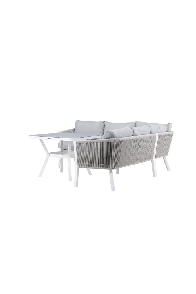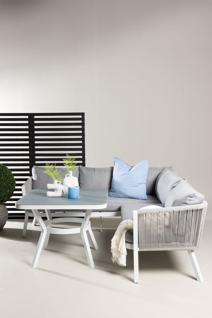 Elegant hörnsoffgrupp med vit aluminium och grå dynor, inklusive glasbord, perfekt för 5 gäster.
