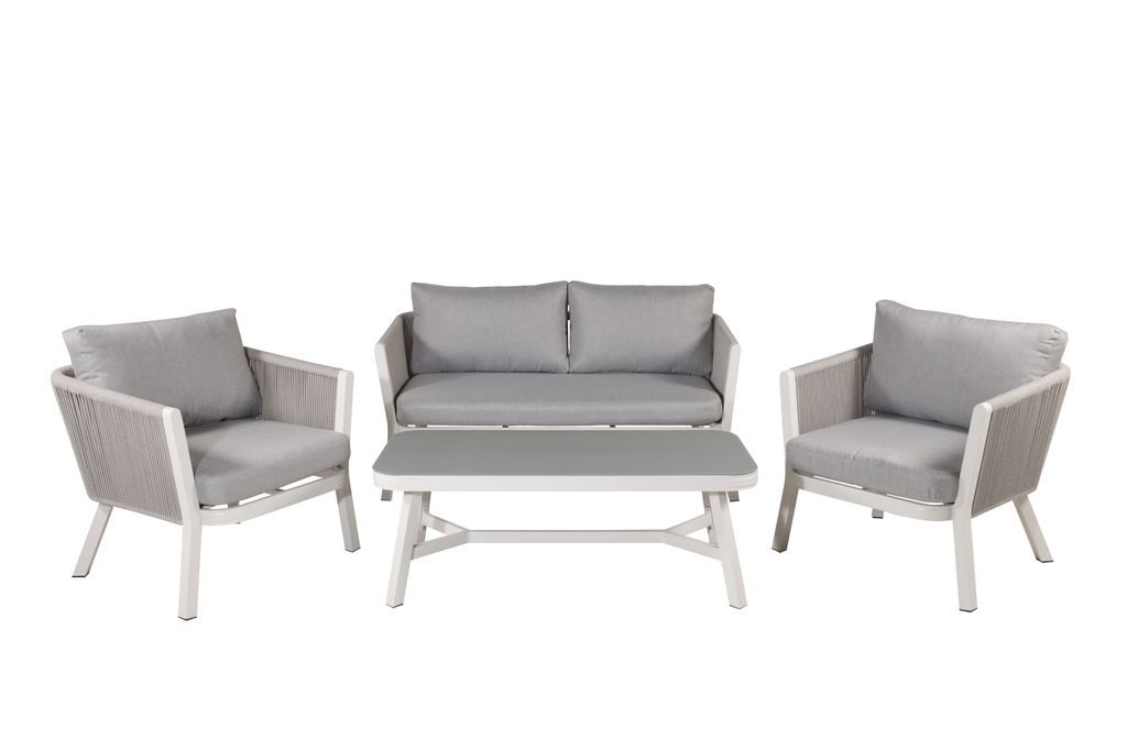 Elegant vit aluminium soffgrupp med grå dynor och glasbord, plats för 4 personer.