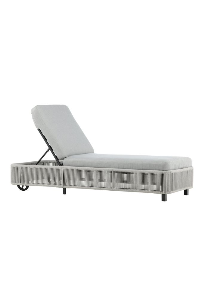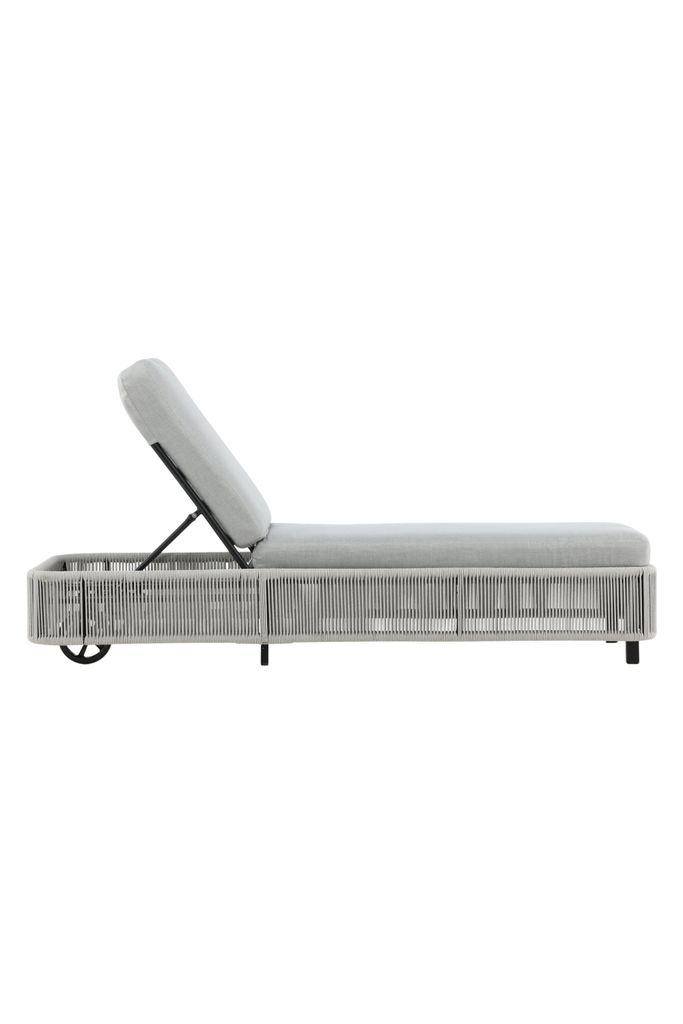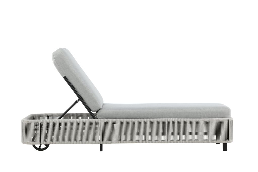 Klassisk solstol i grått med bekväma dynor. Lätt att flytta med hjul och perfekt för soliga dagar.