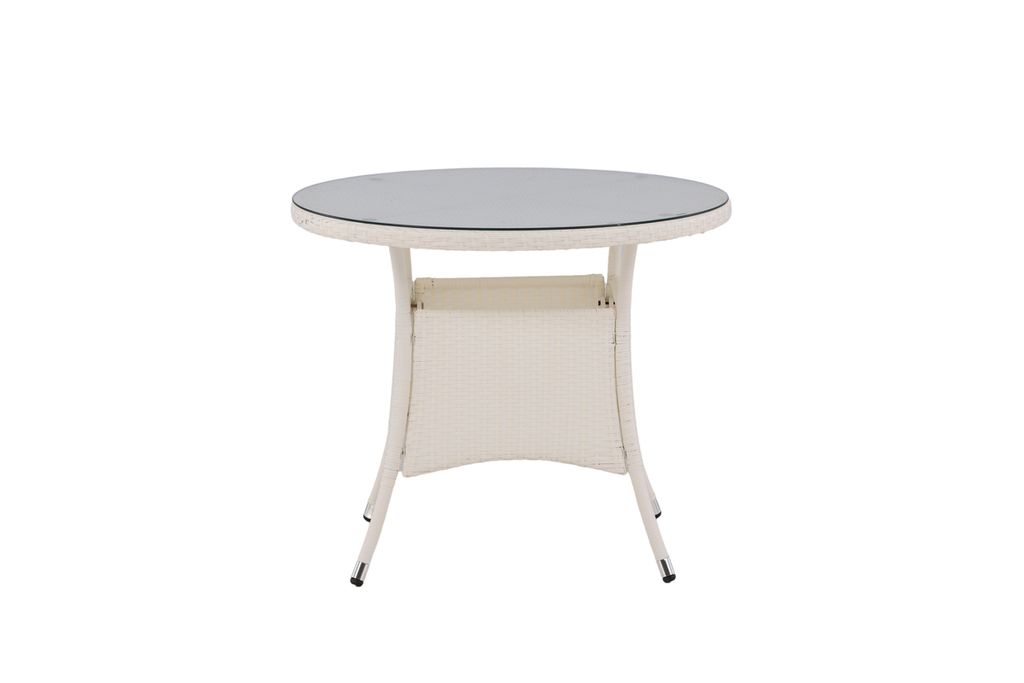 Volta är ett robust runt matbord med stilren glasyta och slitstark vit konstrotting. Perfekt för uterum och uteplatser.