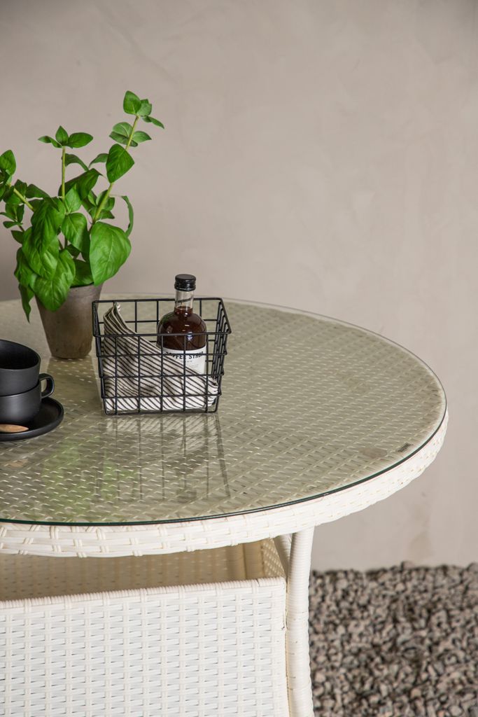 Bordsskivan är gjord av stilrent glas som ger ett elegant och modernt intryck. Underredet är tillverkat i slitstark vit konstrotting, vilket inte bara ger en charmig look utan även säkerställer hållbarhet i det skandinaviska klimatet.