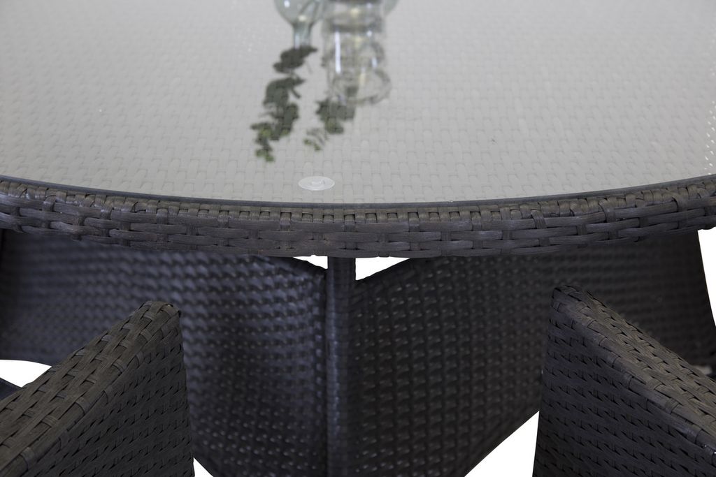 En rund matgrupp är perfekt för dig som vill skapa en trivsam, social och inbjudande känsla till uterummet eller altanen! Här kombineras tidlös design med inbjudande former. Volta är ett runt matbord i robust design som gör ett hållbart och charmigt intryck. Bordsskivan är i stilrent glas och underredet i slitstark, svart konstrotting. Stolarna från serien Malin är i mjuk konstrotting i svart kulör och har integrerade armstöd för extra komfort – Gör er redo för utelivet och låt tiden här bli dagens höjdpunkt!