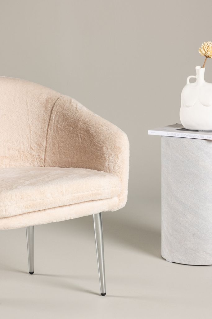 Elegant fåtölj i beige fejkpäls med silvriga stålben, perfekt för att skapa en sofistikerad atmosfär.
