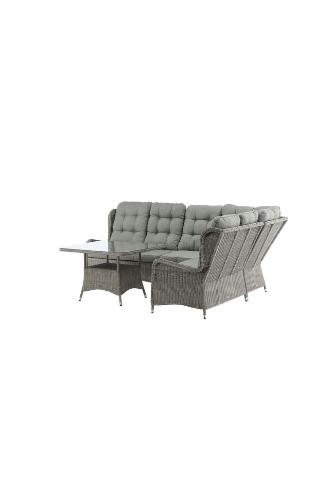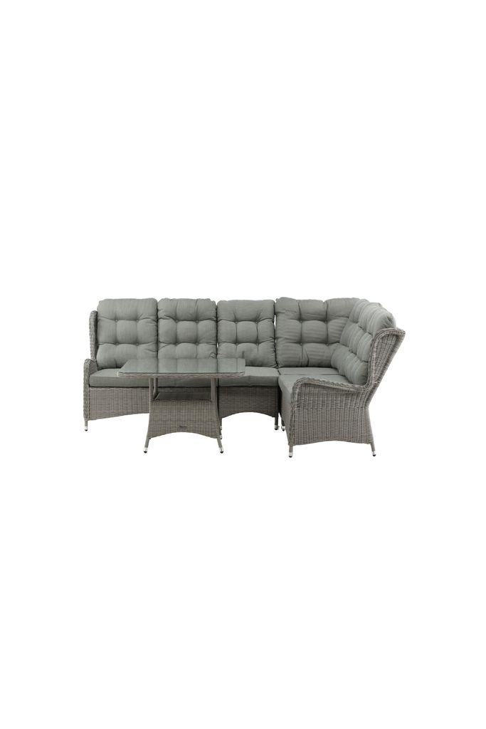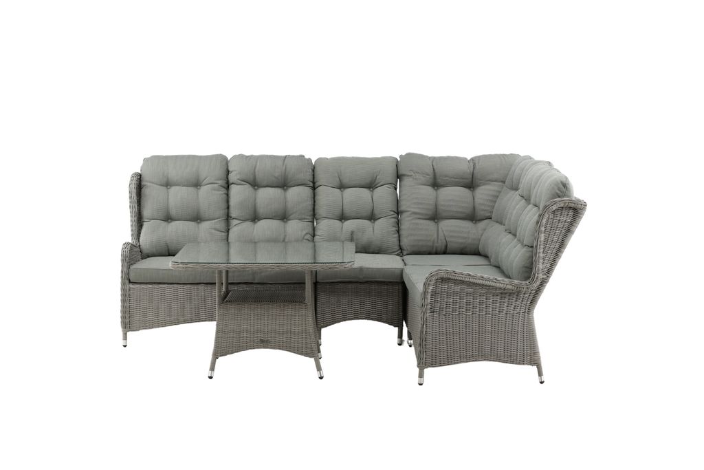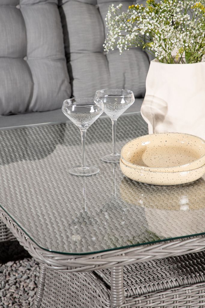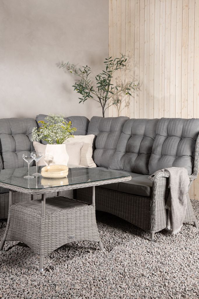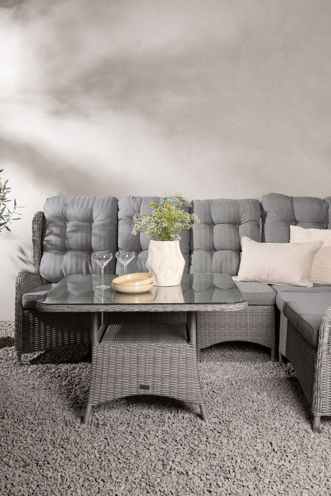 - Design och Material: Tillverkad i slitstark ljusgrå konstrotting med en robust aluminiumstomme, denna loungeset är både väderbeständig och elegant. Det högre soffbordet med glasbordsskiva och avlastningshylla ger en modern touch.