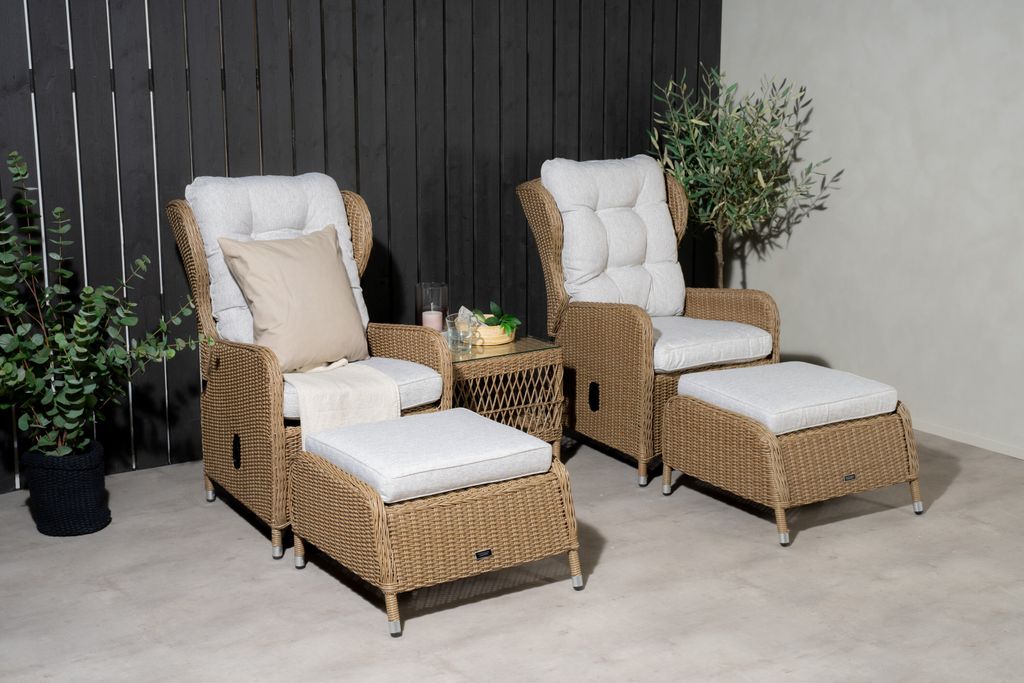 Uppgradera din uteplats med Venture Home Washington Loungegrupp, ett exklusivt loungeset som kombinerar tidlös design med oslagbar komfort. Setet består av två eleganta reclinerfåtöljer och två matchande fotpallar, alla utrustade med mjuka sandfärgade picklade dynor, vilket ger en inbjudande och lyxig känsla.