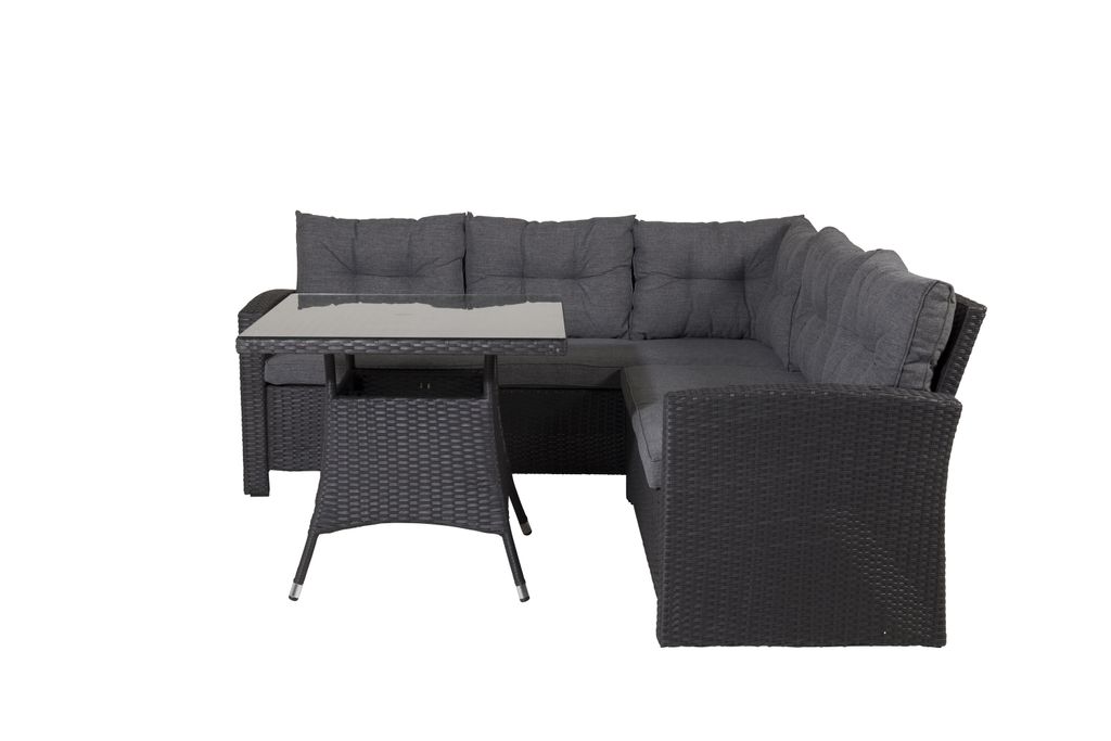 Elegant hörnsoffgrupp i svart konstrotting med mörkgrå dynor och glasbord. Perfekt för uteplatsen.