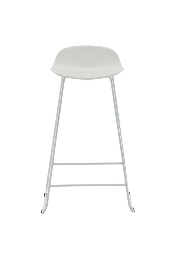 Den vita helgjutna plastsitsen erbjuder både hållbarhet och enkel rengöring – torka enkelt av med en fuktig trasa och ett milt rengöringsmedel vid behov. Den vita pulverlackerade metallställningen ger en solid bas, medan det integrerade fotstödet säkerställer sittkomfort.