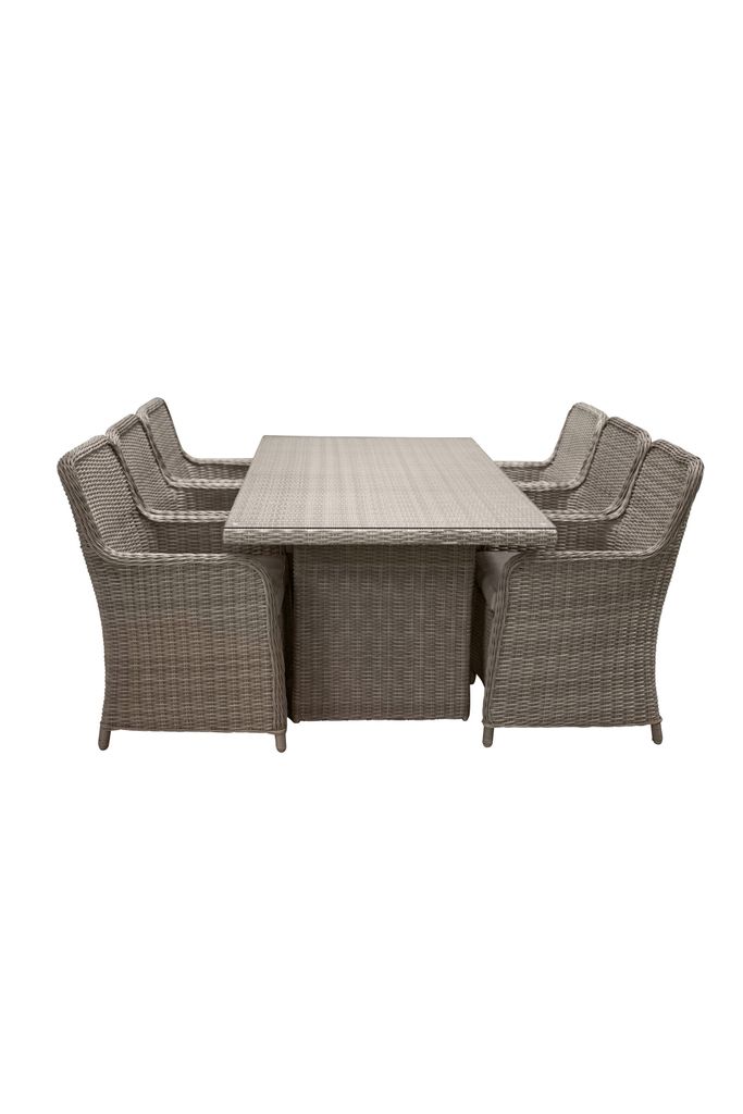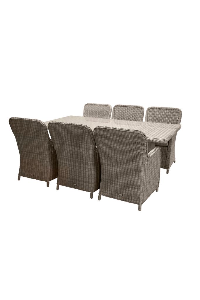 Uppgradera ditt uterum eller trädgård med Venture Home Wembley Matgrupp. Denna matgrupp kombinerar stil och funktionalitet med ett matbord i konstrotting och en elegant bordsskiva i glas. Sex bekväma fåtöljer medföljer, alla klädda i en jordnära beige kulör som smälter in naturligt i din utomhusmiljö.