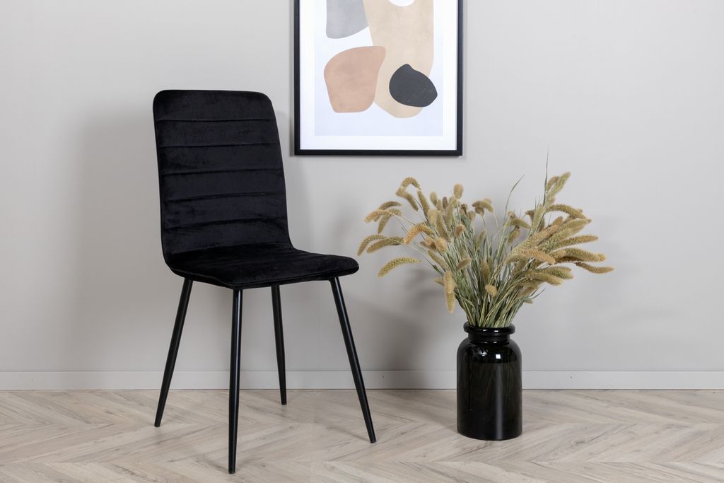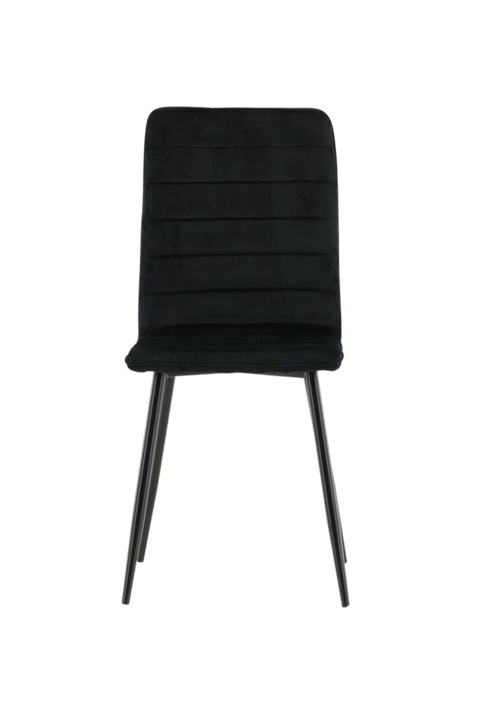 Stilren och komfortabel matstol i svart sammet med nordiska, raka former och eleganta järnben.