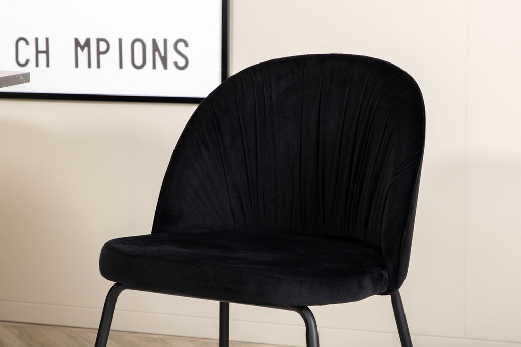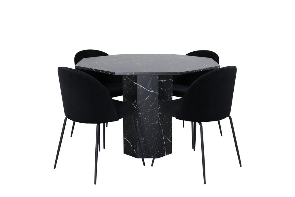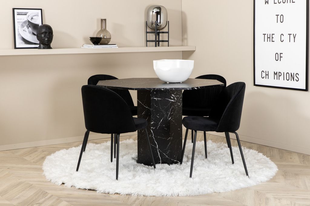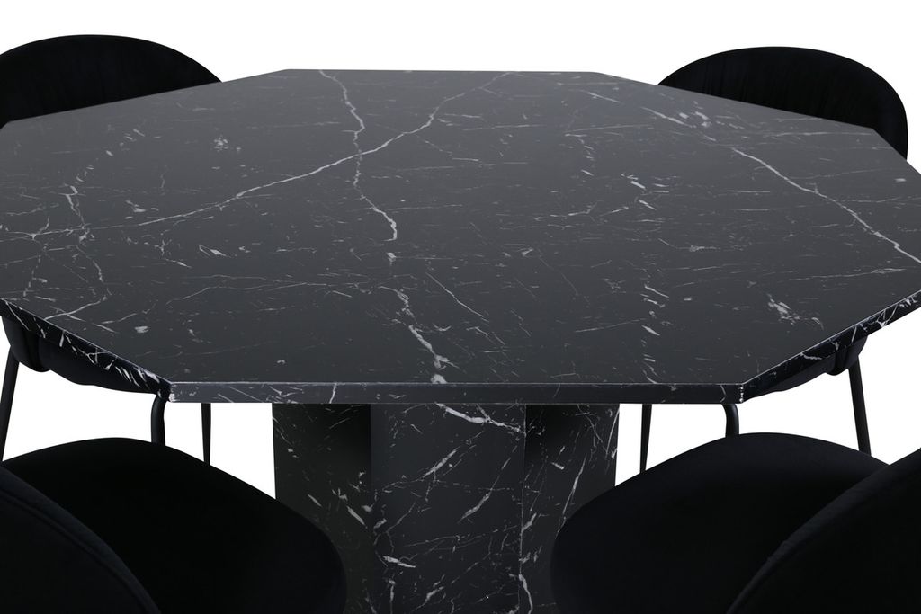 Skapa en inbjudande gemenskap kring ett runt matbord! Matbordet Marbs är format som en oktagon och har en helklädd design med en toppskiva i svart marmorglas med spräckligt vitt mönster och bordsben i MDF och marmorpapper. Bordets mått: Diameter: 110cm, Höjd: 75cm. Matchas här med 4st matstolar från serien Wrinkles - en stoldröm med hög sittkomfort och smäcker design. Stolsbenen är i svart metall och sitsen i mjukt sammetstyg. Stolens mått: Höjd: 79,5cm, Sitthöjd: 49,5cm, Bredd: 49cm, Djup: 50cm. Låt hemmets hjärta prydas av den här iögonfallande matgruppen.
