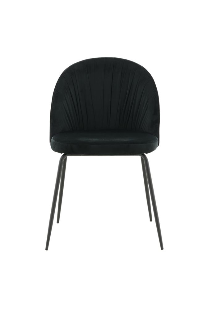 Stilrena matstolar med rynkad svart sammet och svart metall. Bekväma och moderna.