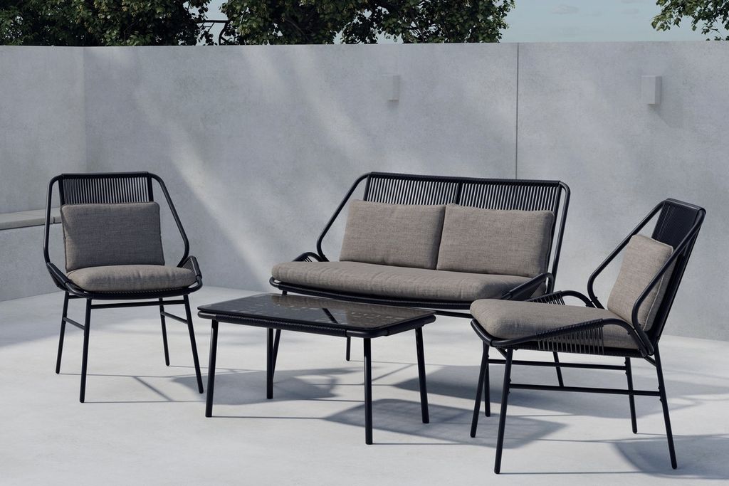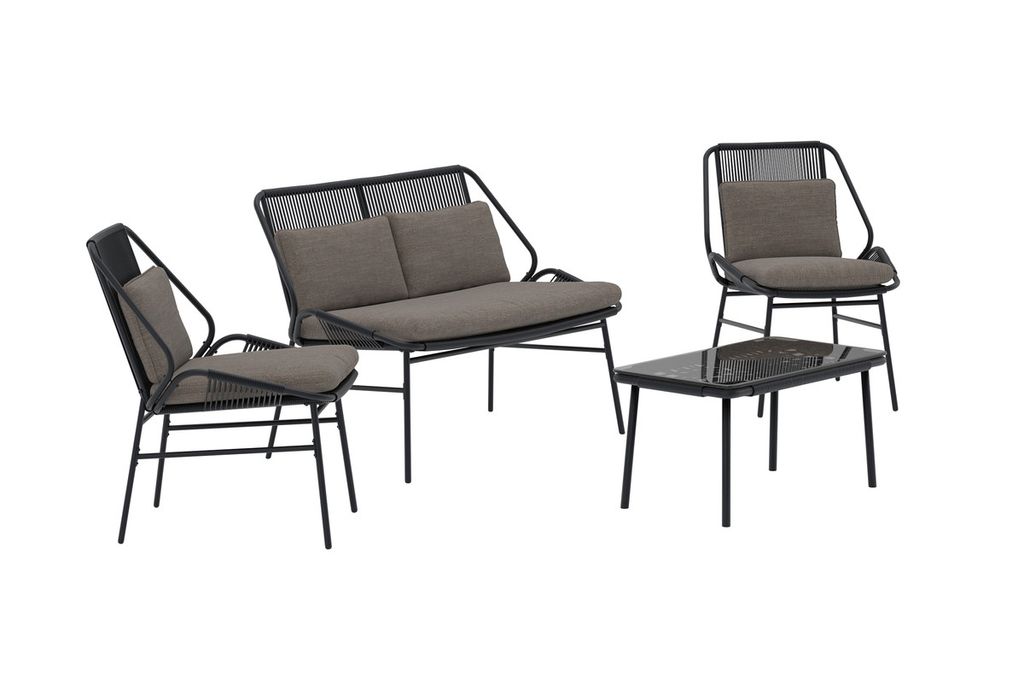 Zakynthos soffgrupp är en stilren och modern möbelgrupp som skapar en avslappnad känsla på uteplatsen. Gruppen består av en soffa, två fåtöljer och ett matchande bord i en elegant svart design med bekväma mörkgrå dynor. Den luftiga konstruktionen ger ett lätt och modernt uttryck, samtidigt som dynorna gör att du sitter skönt under både korta och långa stunder. Zakynthos soffgrupp är det perfekta valet för dig som vill kombinera komfort med trendig design i trädgården eller på altanen.