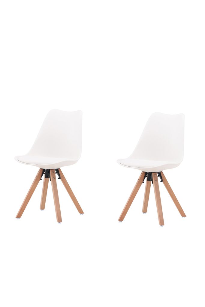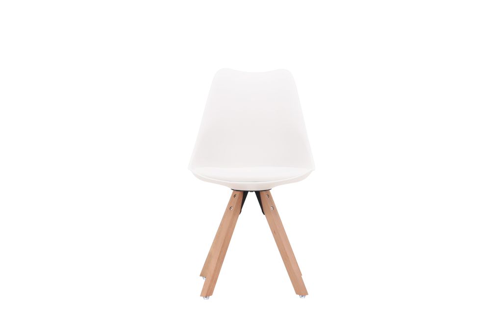 Elegant matstol i vit plast med träben och hög komfort, perfekt för moderna hem.