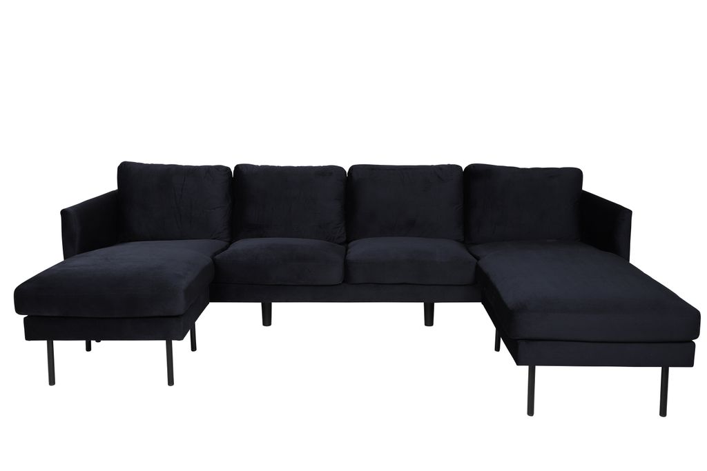 Denna divansoffa är utformad med två generösa divaner och en iögonfallande design som präglas av raka, nordiska linjer. Metallben i svart ger en modern kontrast och skapar ett elegant helhetsintryck. De smala benen bidrar till ett luftigt och stilrent utseende.
