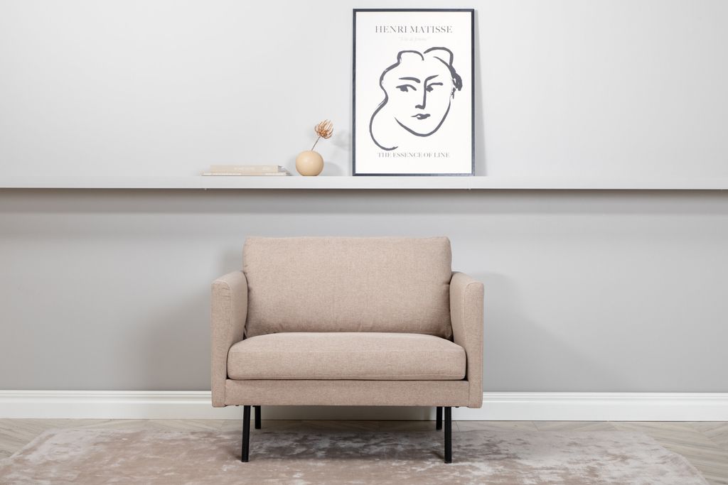 Zoom fåtölj kombinerar nordisk design med bekväma former, klädd i beige tyg med eleganta svarta metallben.