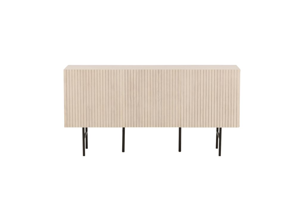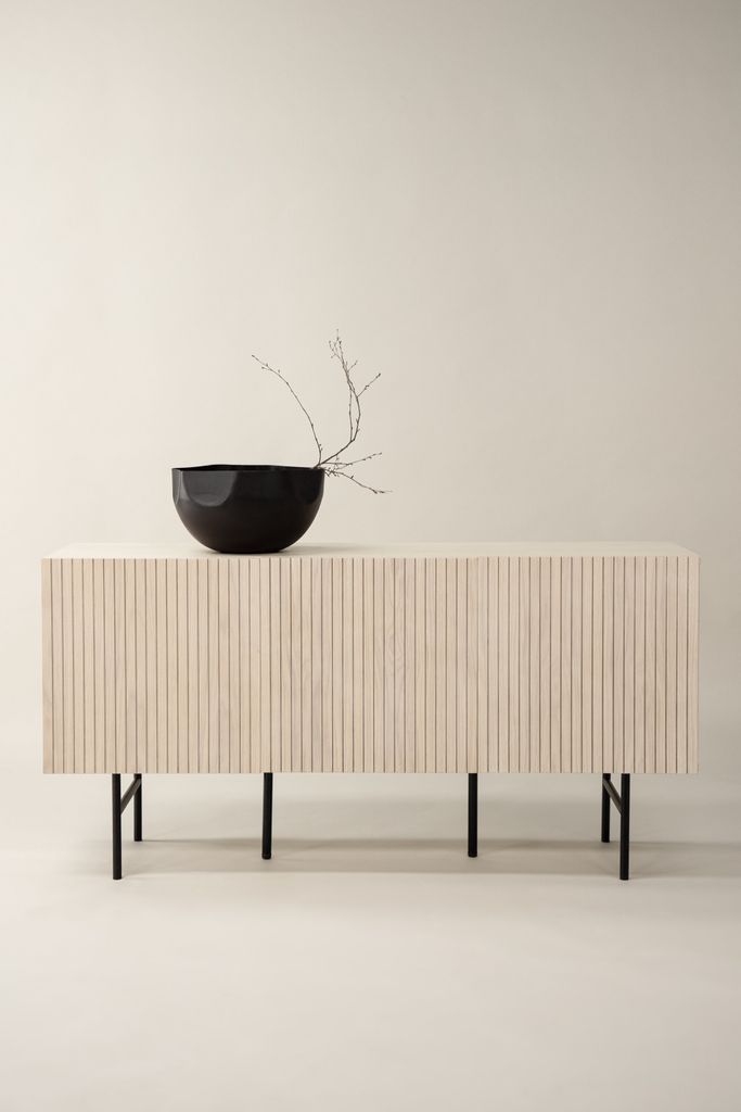 Utforska det eleganta Vind Collection Björkön Low Cabinet, ett mästerverk inom skandinavisk design. Detta avlastningsskåp har en stilren ribbad design med tre luckor som öppnar upp till två praktiska hyllplan, vilket erbjuder generös dold förvaring. Tillverkad av högkvalitativ vitputsad faner, skåpet står stadigt på smala ben i svart stål som ger ett luftigt och modernt intryck.