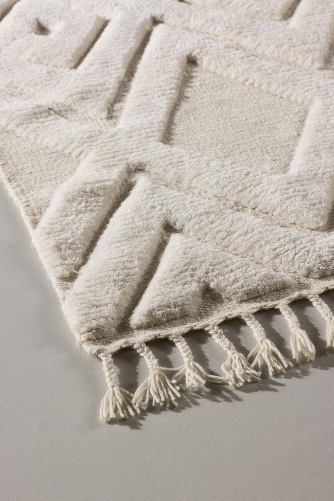 Modern och tidlös ullmatta med krämvit färg och strukturerat mönster som ger djup och elegans.