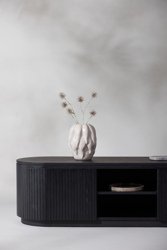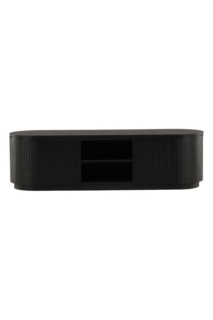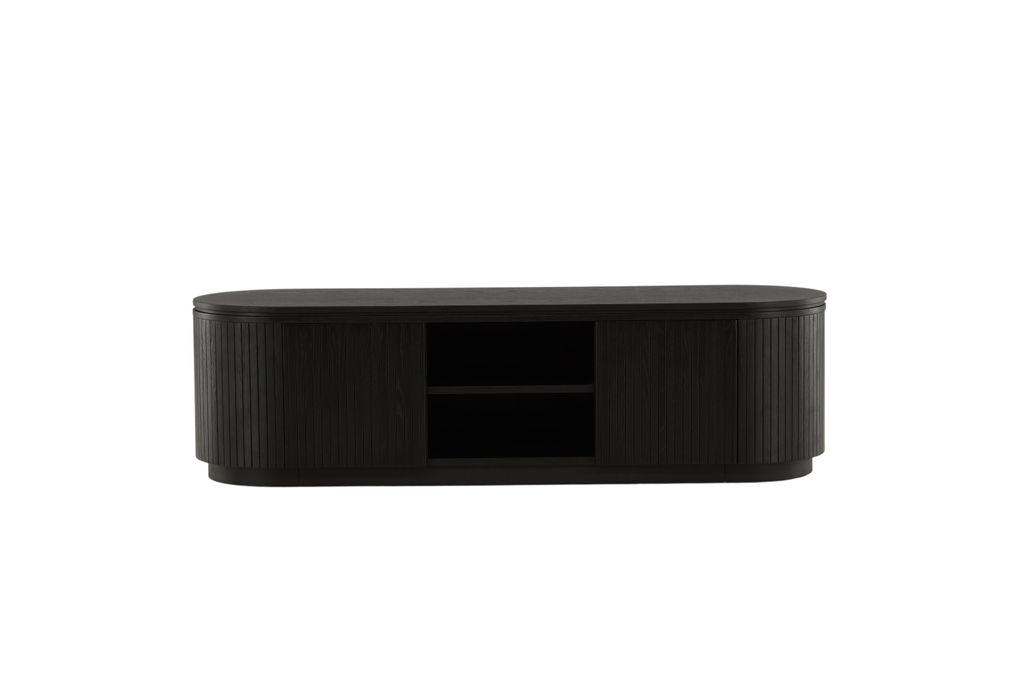 Elegant skänk i svart ek med dold förvaring och öppna hyllor. Perfekt som tv-bänk eller sidobord.