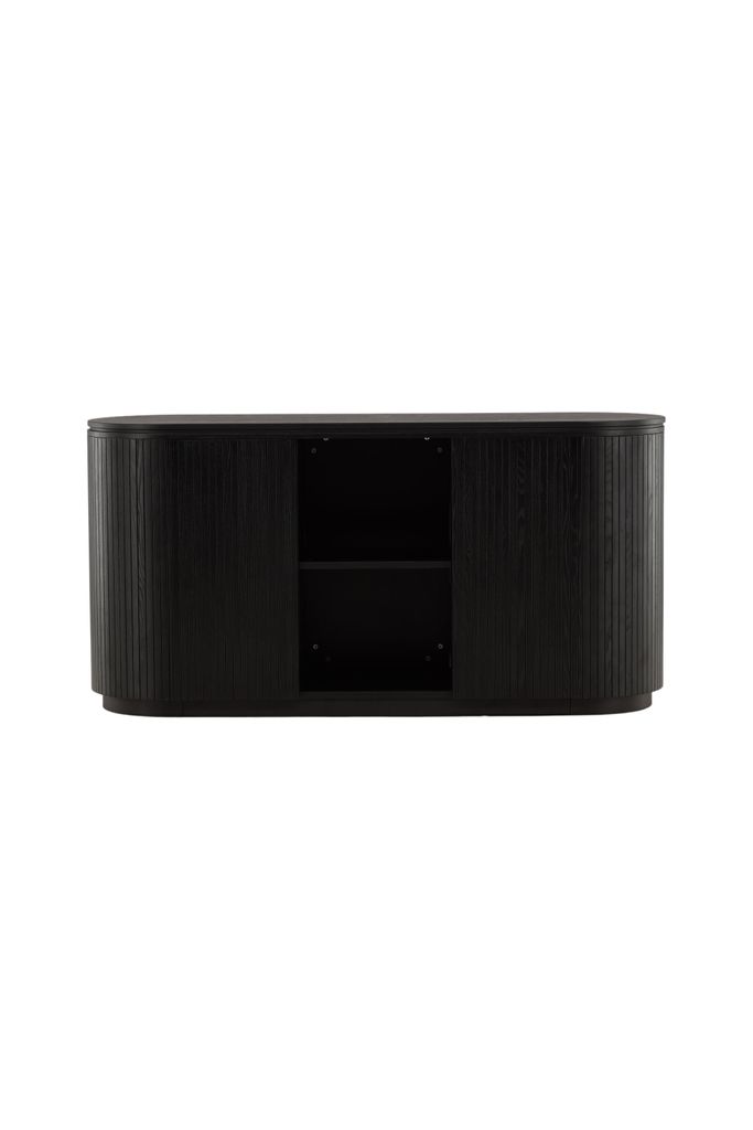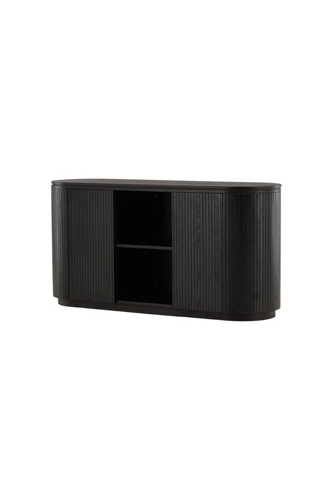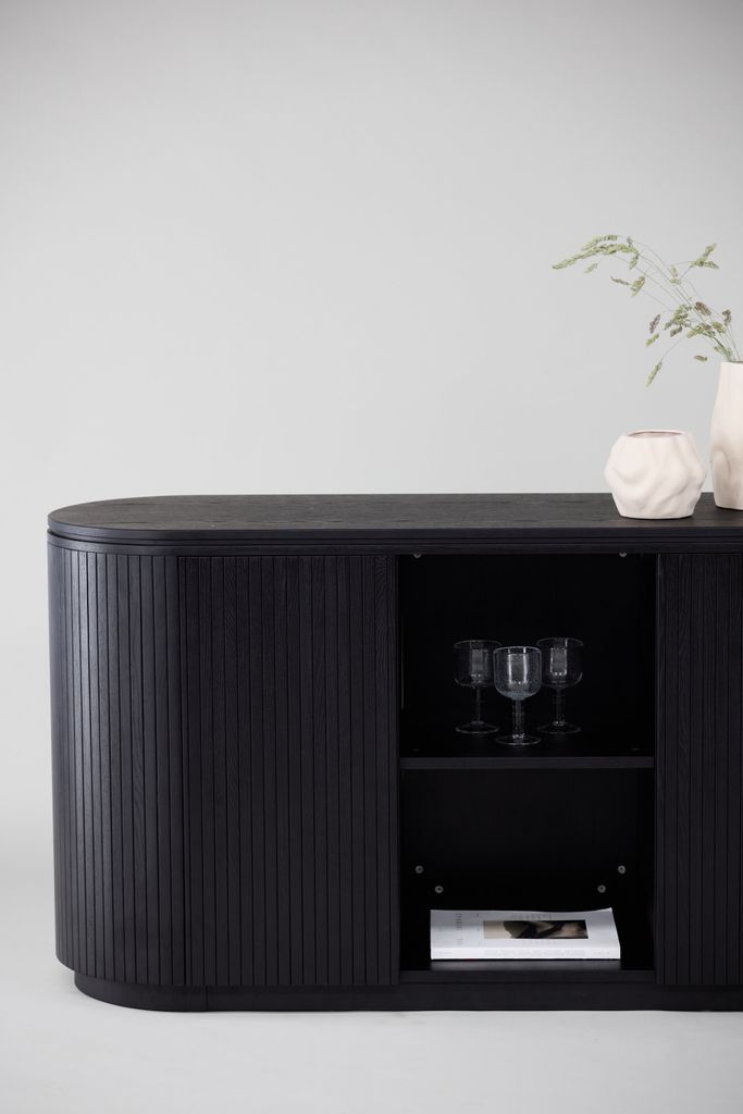 Elegant ovalt skåp i svart ek med både synlig och dold förvaring, perfekt för stilfull inredning.