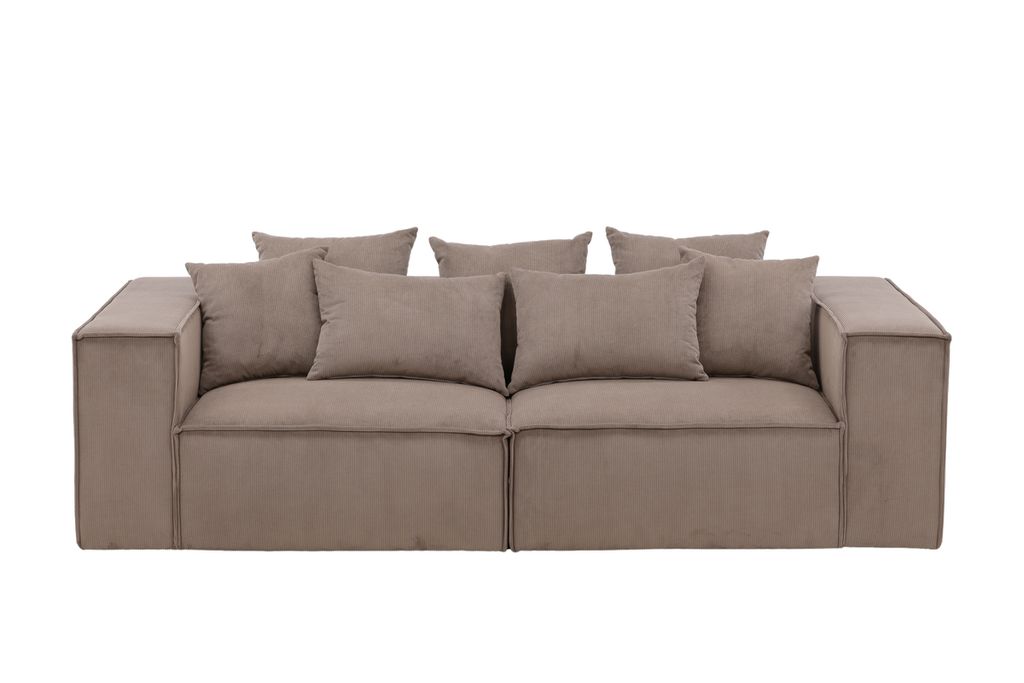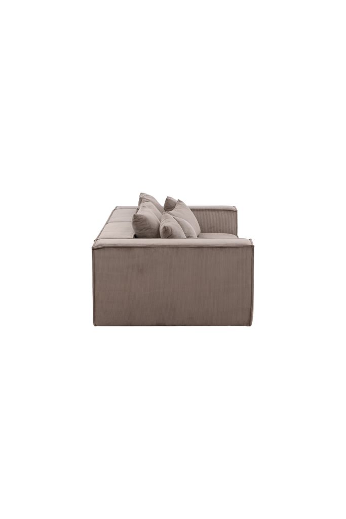 Elegant 3-sits soffa i brunt manchestertyg med 50-talsinspiration, erbjuder komfort och stil med breda armstöd och trendiga kuddar.