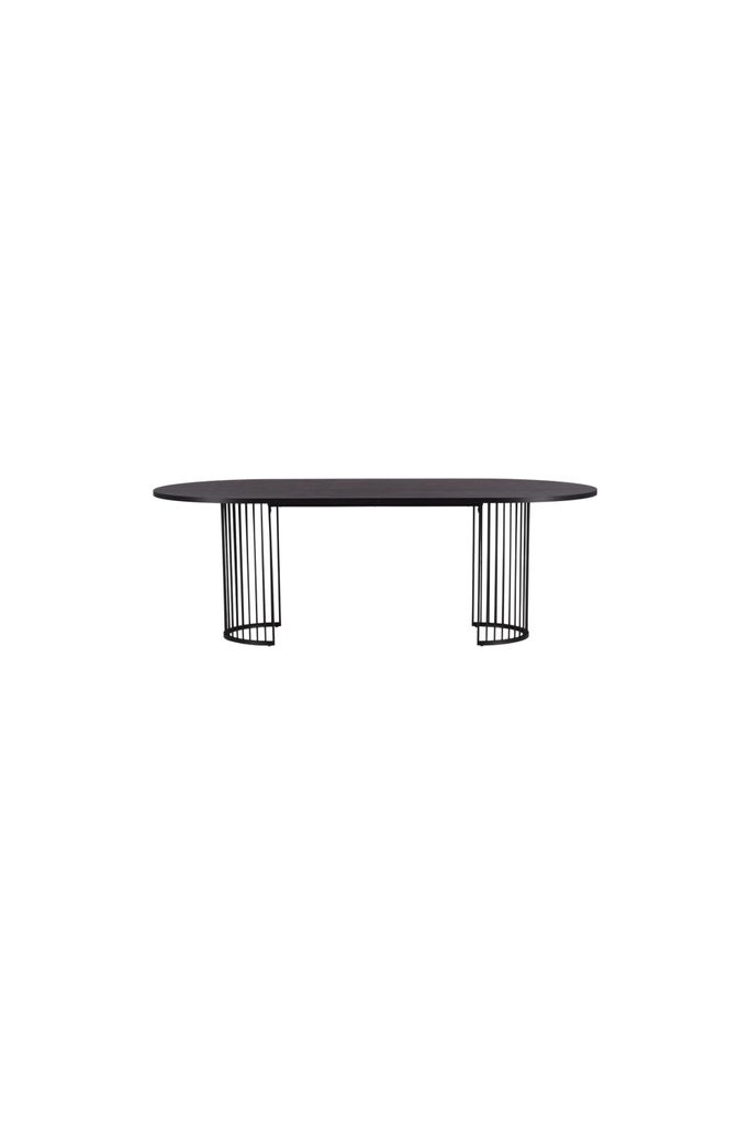 Modernt ovalt matbord i svart MDF med dekorativt halvmåneformat underrede i svart metall. Perfekt för stilmedvetna hem.