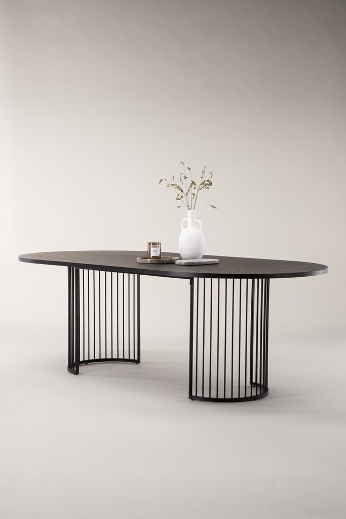 Vind Collection Hamneskär Bord är ett stilfullt och modernt tillskott till ditt hem. Med sin eleganta ovala bordsskiva i svart MDF och ett unikt halvmåneformat underrede i svart metall, blir detta bord en central del i varje rum. Underredets ribbade design ger en känsla av lätthet och modernitet samtidigt som det erbjuder solid stabilitet. Bordets helsvarta färg gör det enkelt att matcha med olika inredningsstilar, vilket ger dig friheten att skapa en personlig och inbjudande atmosfär. Komplettera detta imponerande bord med bekväma matstolar för att skapa en elegant och välkomnande matsalsmiljö.