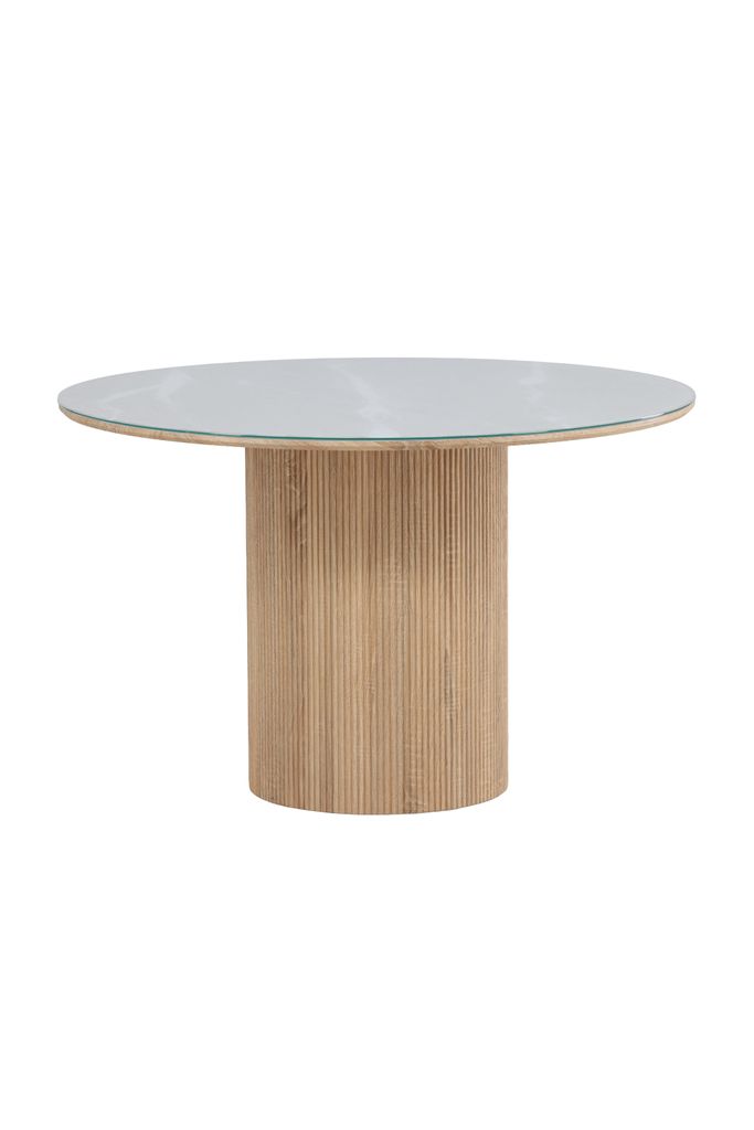 Stilrent och modernt matbord med FSC-certifierat trä. Diameter på 120 cm för 4-6 personer. Elegant glasskiva och ribbat ben.