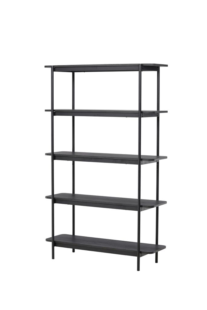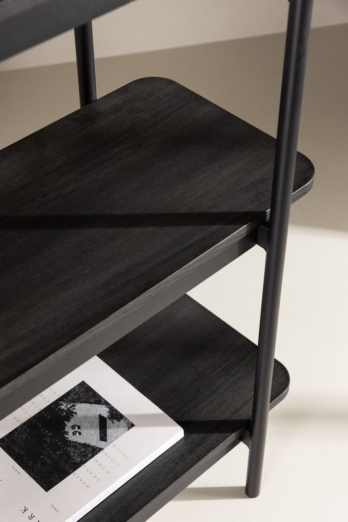 Designad med en stilren svart stålram, erbjuder denna hylla tre rejäla hyllplan som ger gott om plats för dina favoritböcker, dekorativa föremål och växter. Den mörka träfinishen ger en elegant kontrast till stålramen och smälter väl in i alla typer av inredningsstilar.