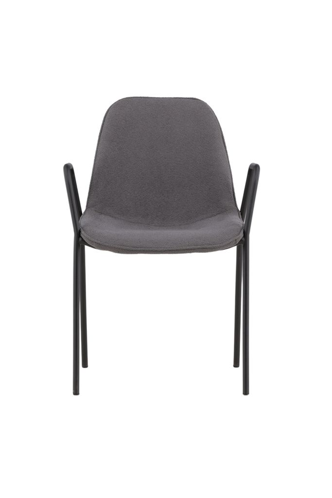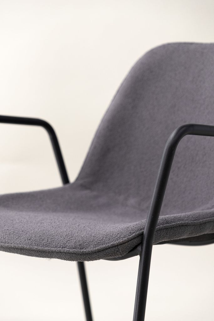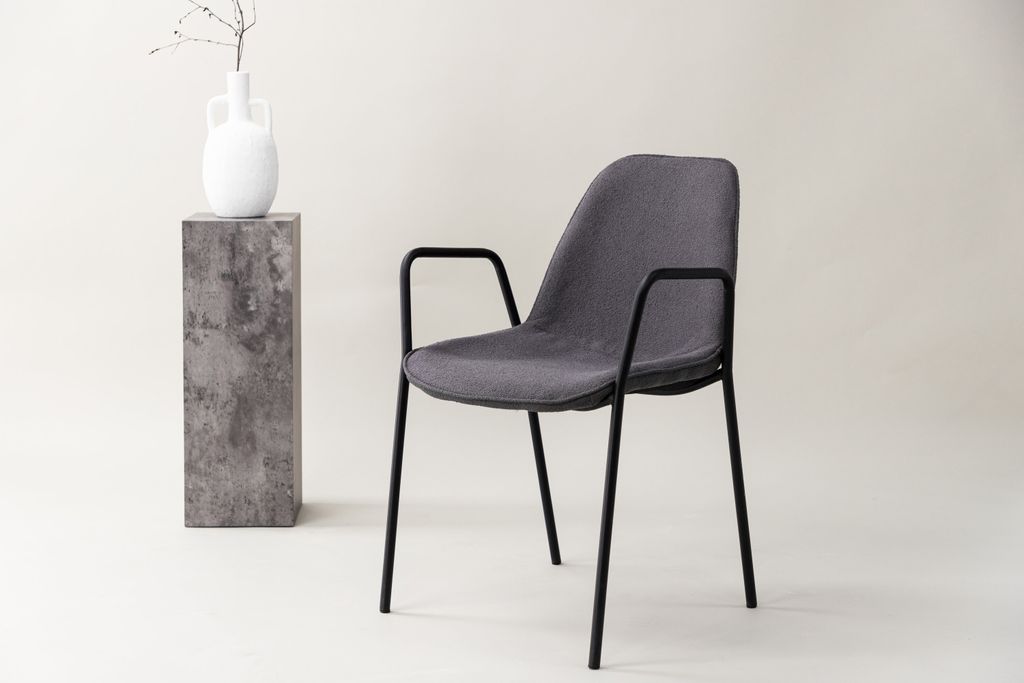 - Material och Färg: Sitsen är tillverkad av boucle och foam i en elegant mörkgrå färg, medan benen är gjorda av hållbart svart stål.