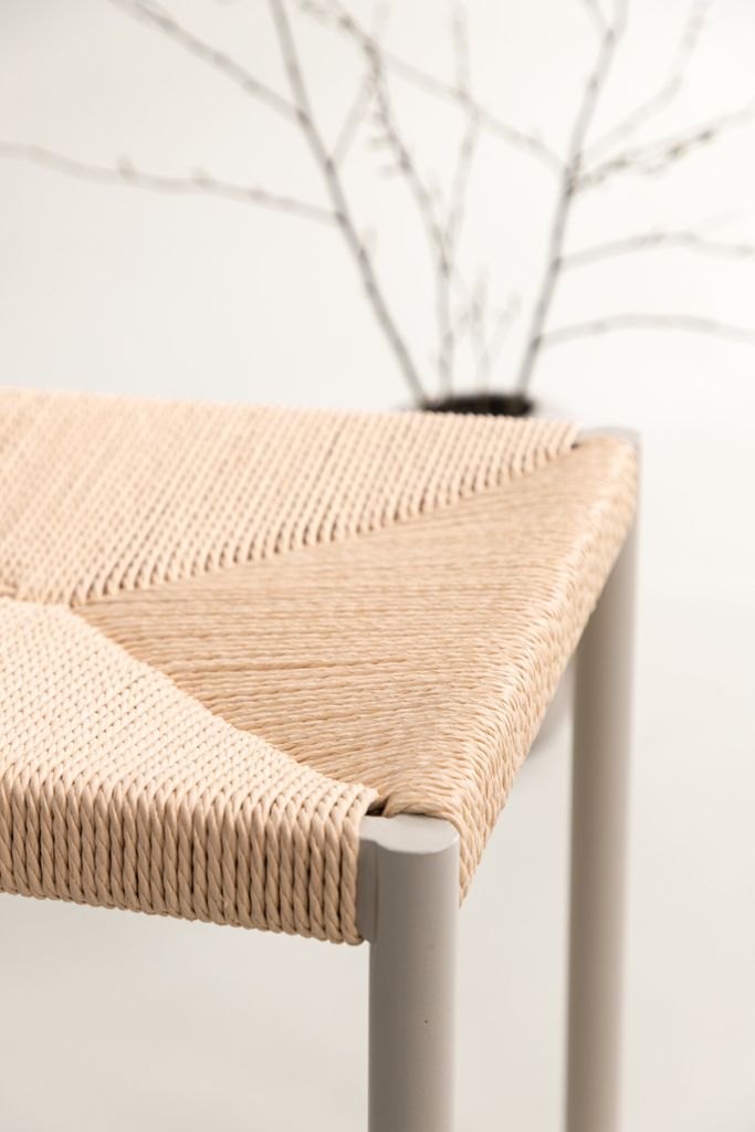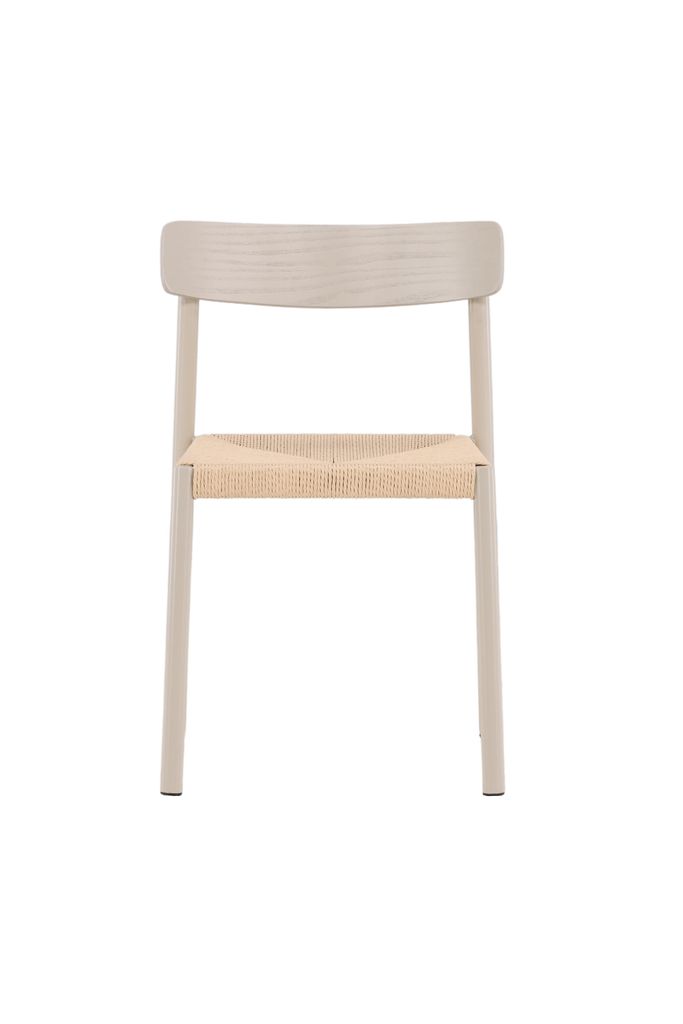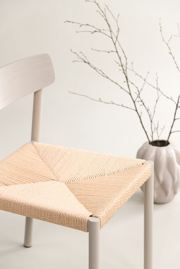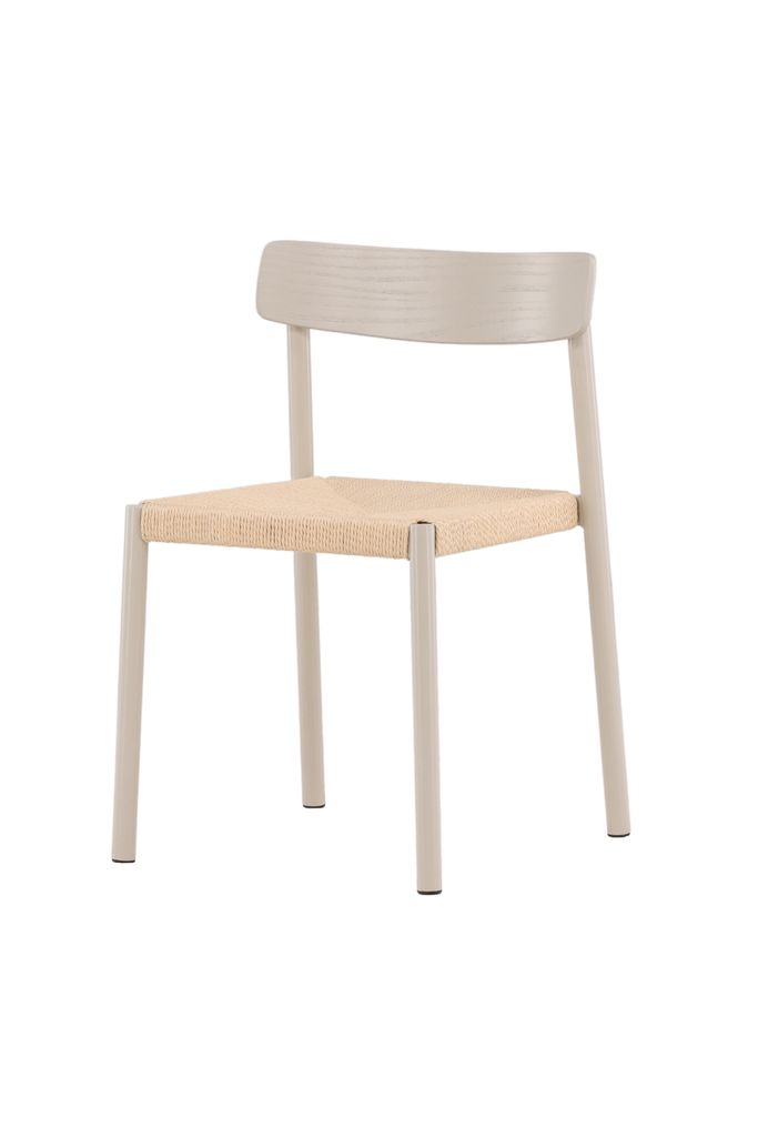 Skandinavisk matstol i beige och greige, med hållbar sits i rep och metallben. Perfekt för stilrena middagar.