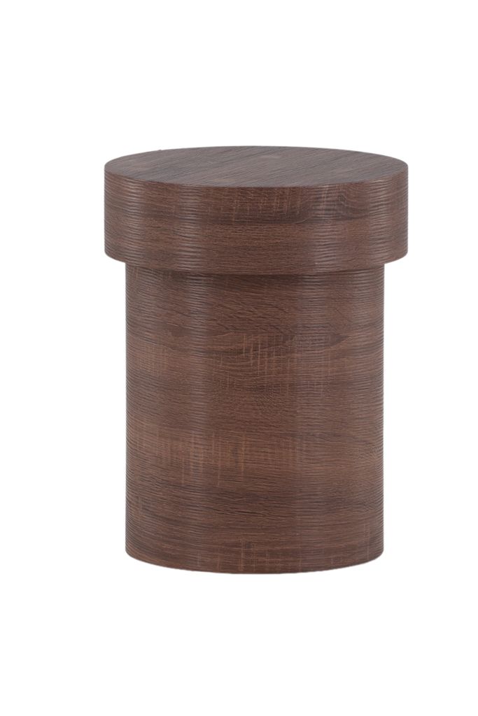 Elegant sidobord i mörkbrun MDF med cylinderform och två nivåer. Perfekt som avlastningsyta eller piedestal.