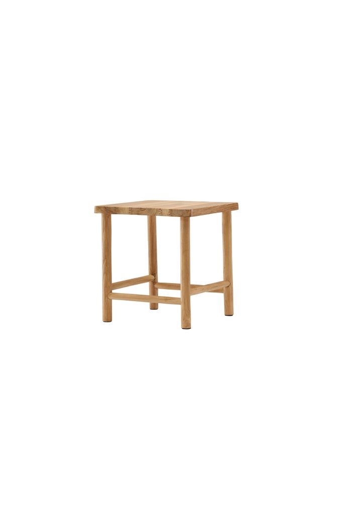 Elegant och mångsidig pall i teak med kvadratisk sits och cylinderformade ben, perfekt för extra sittplatser eller som sidobord.