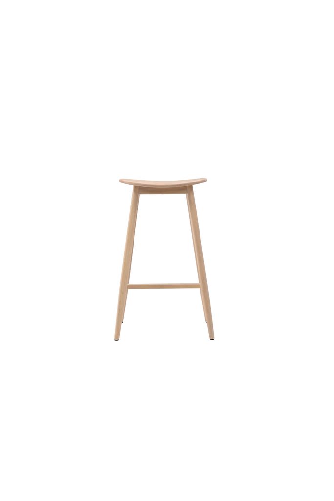Orust barstol i vitputsat trä med rundad sits och integrerat fotstöd för extra komfort. Perfekt för bardiskar och matbord.