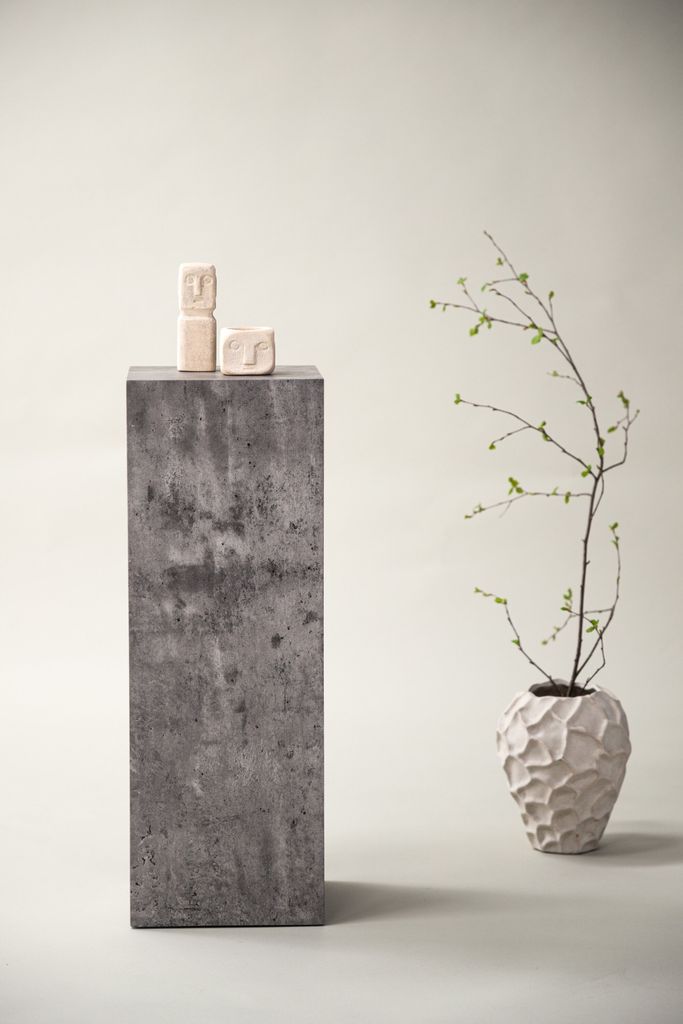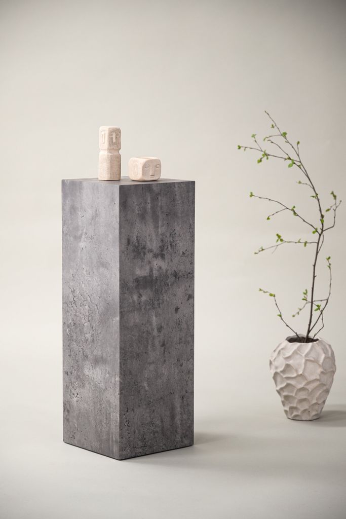 Elegant piedestal i industriell design med spräcklig betongfinish. Perfekt för växter eller dekorationer.