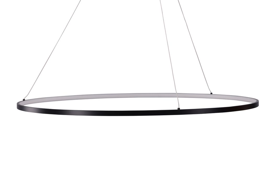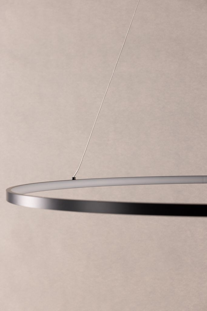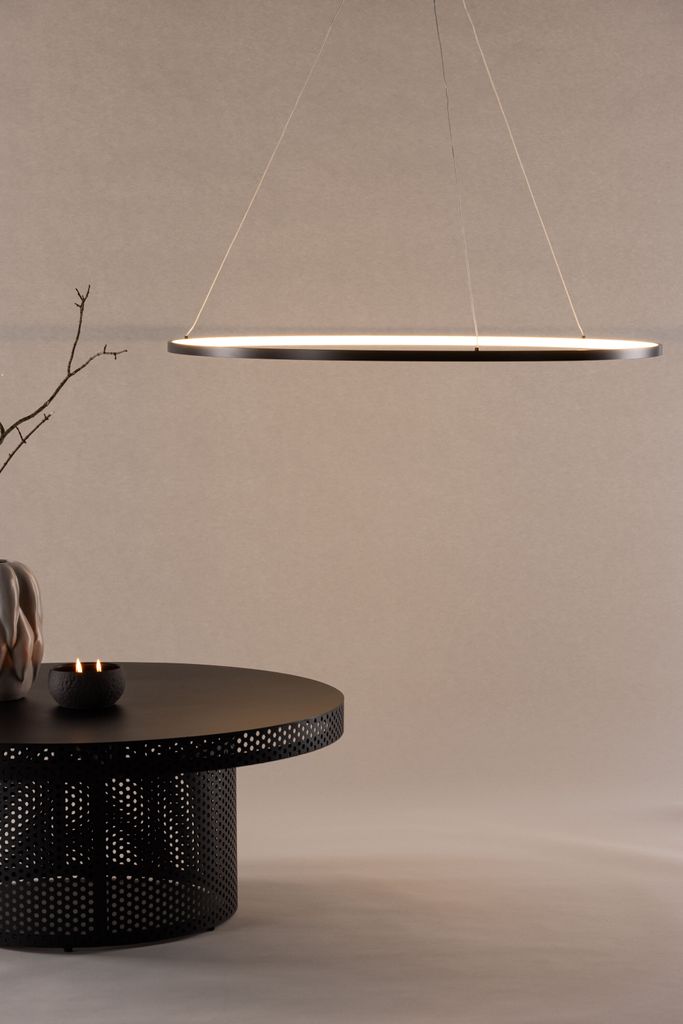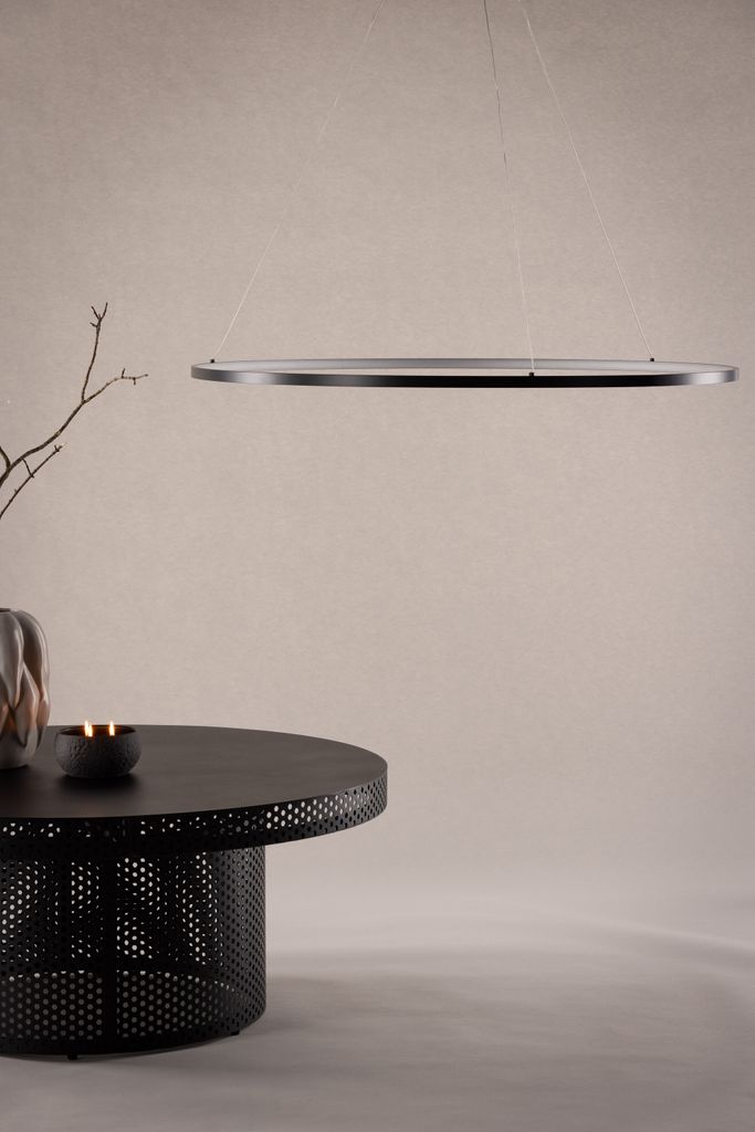 Lampans generösa diameter på 100 cm ger ett lyxigt intryck och drar blickarna till sig. Den tunna ringen i svart aluminium skapar en elegant silhuett, och med en total höjd på endast 6 cm ger den ett smidigt och modernt utseende. Passar perfekt för dig som söker en diskret men effektfull belysning.