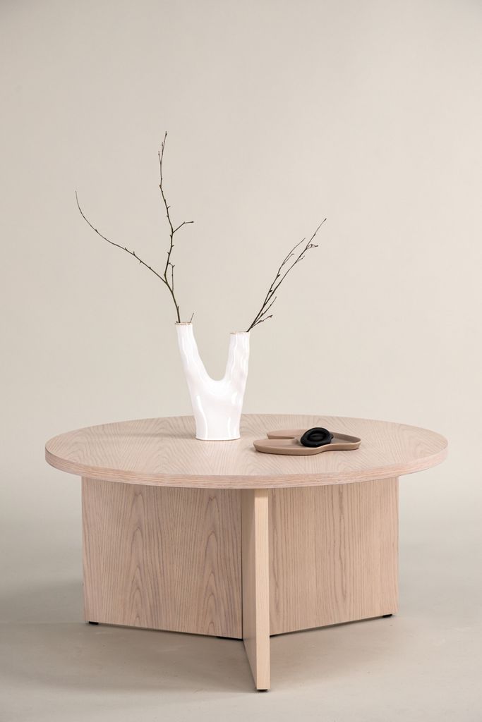 Bordet mäter ⌀65 cm i diameter och har en total höjd på 32,5 cm, vilket gör det till en perfekt mittpunkt i vardagsrummet. Den vitputsade finishen ger en ljus och luftig känsla, och materialvalen MDF och faner säkerställer både hållbarhet och estetik.