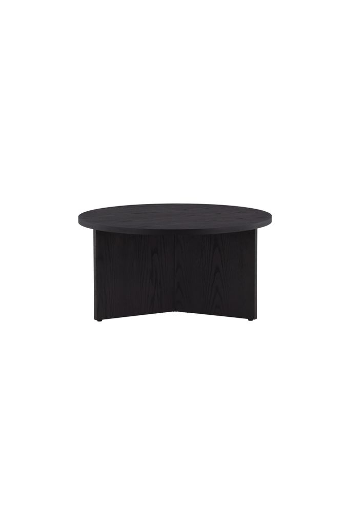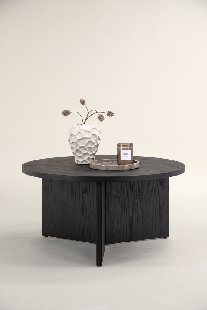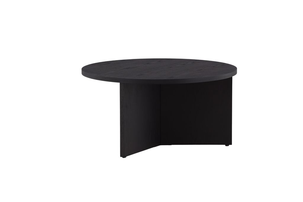 Saltö är ett stilrent soffbord i svart MDF med en rund toppskiva och centrala ben. Perfekt för att lyfta din inredning.
