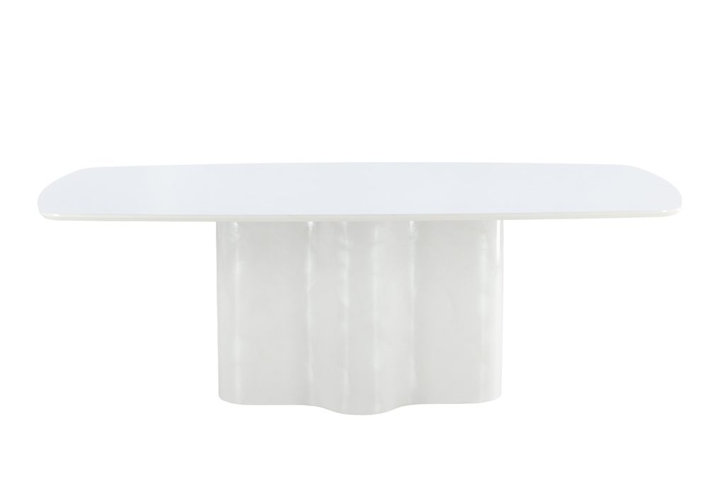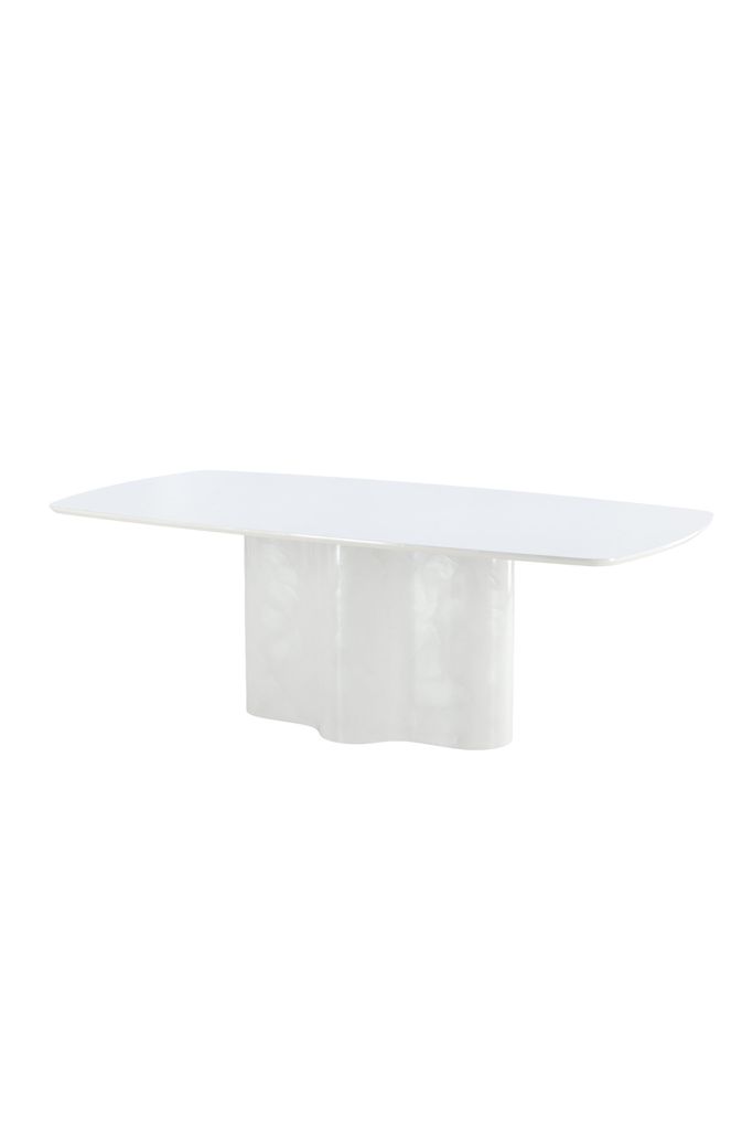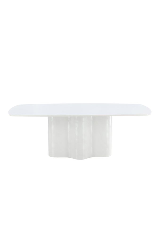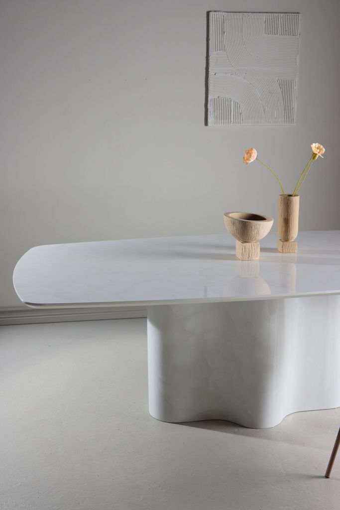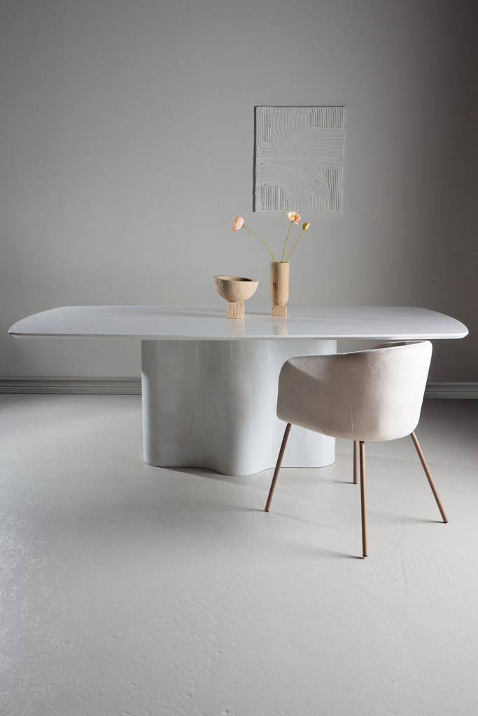 Det centrerade bordsbenet är inte bara en unik designfunktion utan ger också extra benutrymme och frihet i möbleringen. Den vita färgen med en subtil glans skapar ett ljust och luftigt uttryck som lyfter hela rummet.