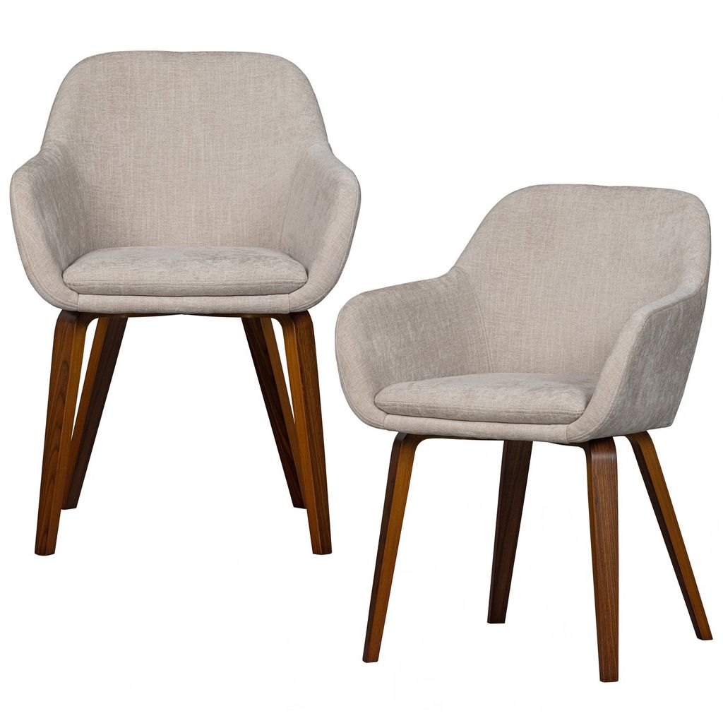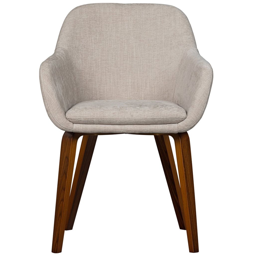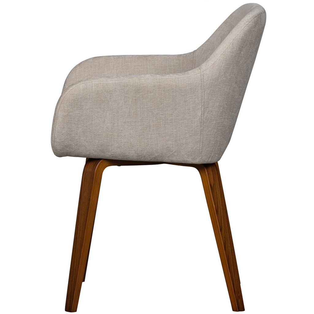 Elegant matstol i sandfärgad sammet med valnötsfaner, tidlös design och utmärkt komfort.