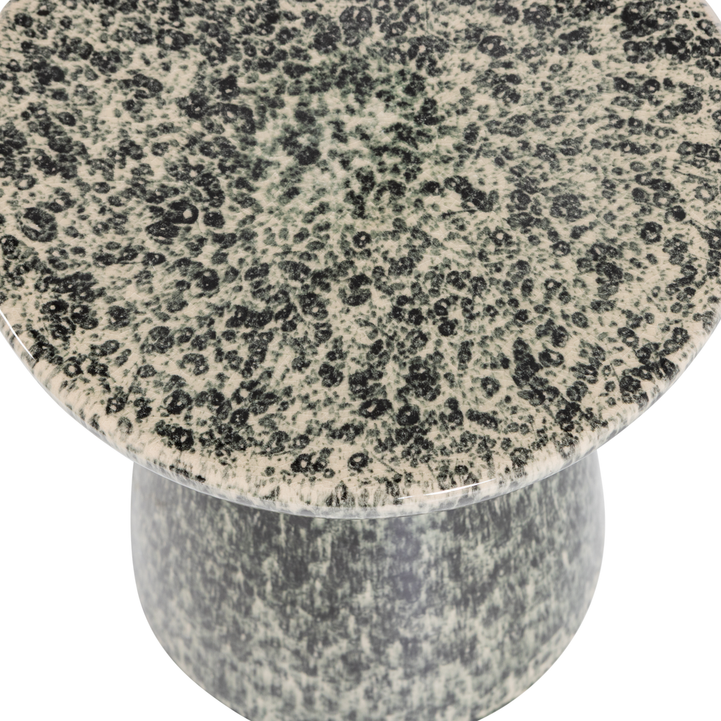 Ett skulpturalt sidobord i högkvalitativ keramik med unikt mörkgrått melange-mönster. Perfekt för både vardagsrum och sovrum.