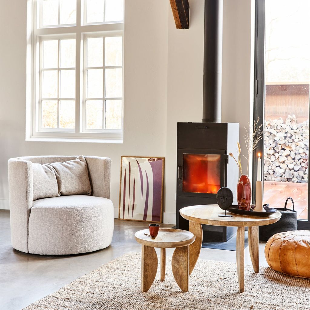 Design och funktion: Med sina mjukt rundade kanter och varma, gyllene toner smälter dessa bord in i de flesta miljöer. Den mindre varianten (H 40 cm, Ø 40 cm) kan placeras under den större (H 47 cm, Ø 70 cm) för en lekfull visuell effekt eller användas separat som soffbord eller växtbord.