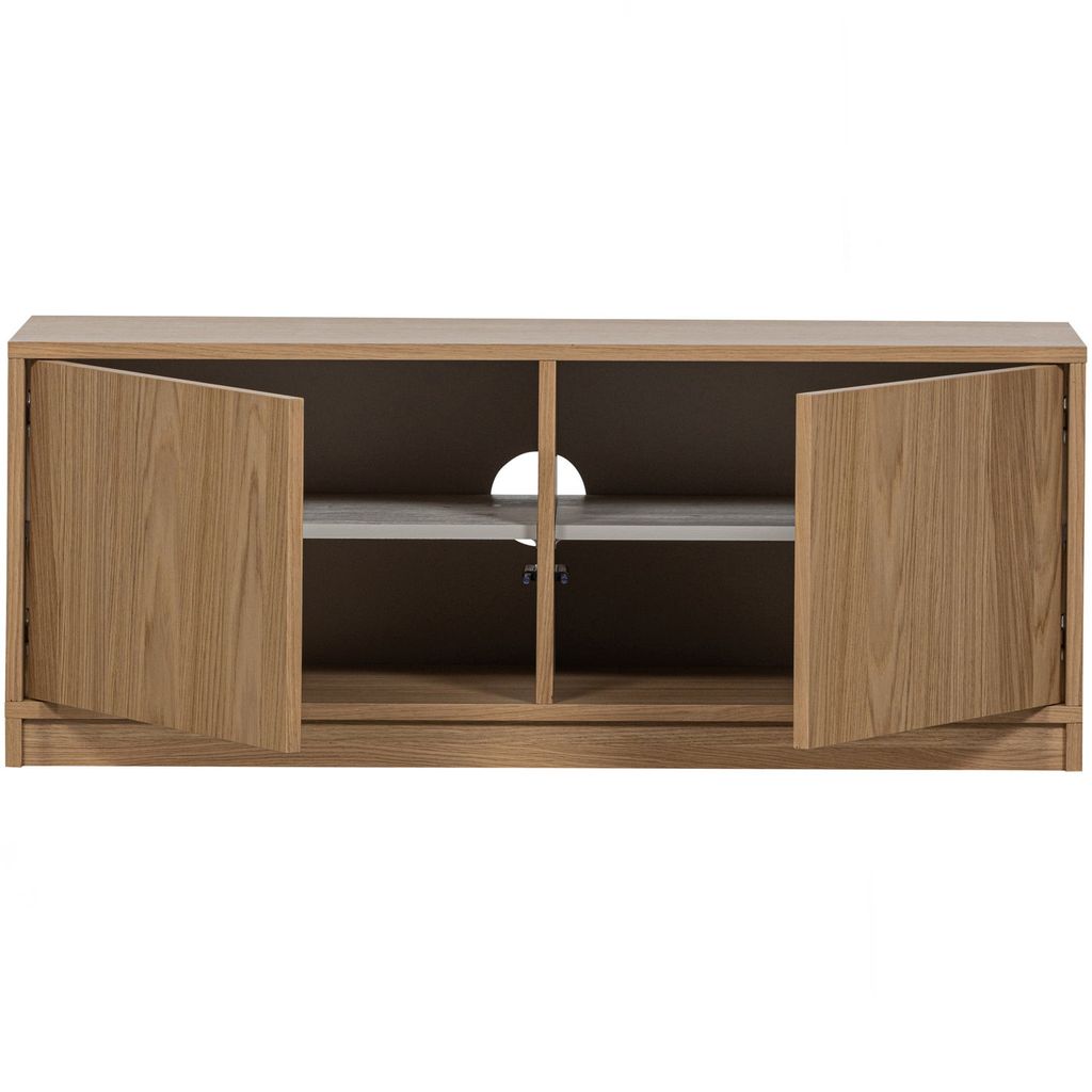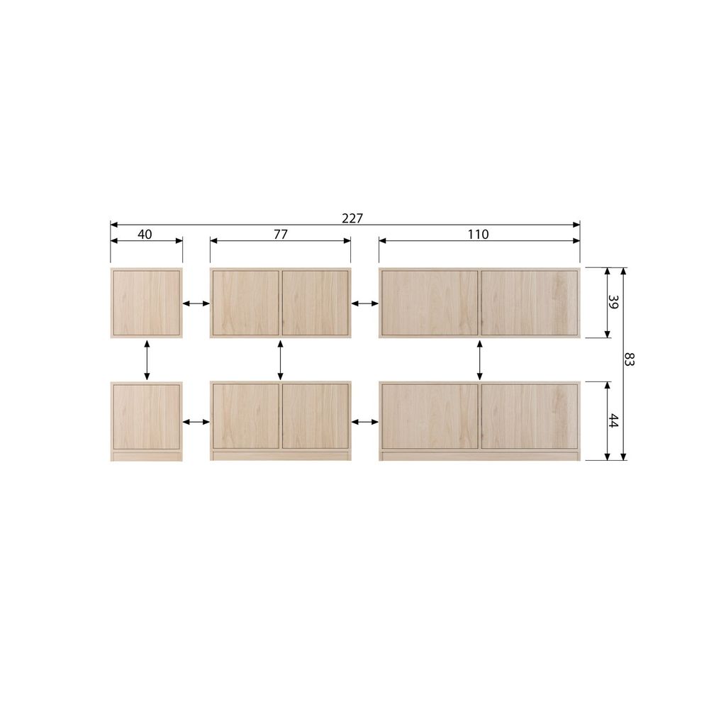 Skåpets mått är H 44 cm x B 110 cm x D 40 cm, vilket ger gott om förvaringsutrymme med sina fyra sektioner. Varje sektion är utrustad med ett praktiskt push-to-open system för enkel åtkomst. Den naturliga ekens ljusbruna ton och tydliga ådring gör varje skåp unikt och personligt.