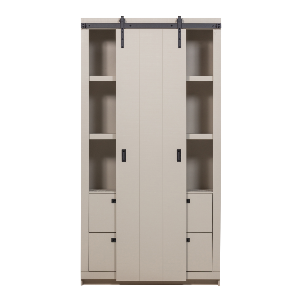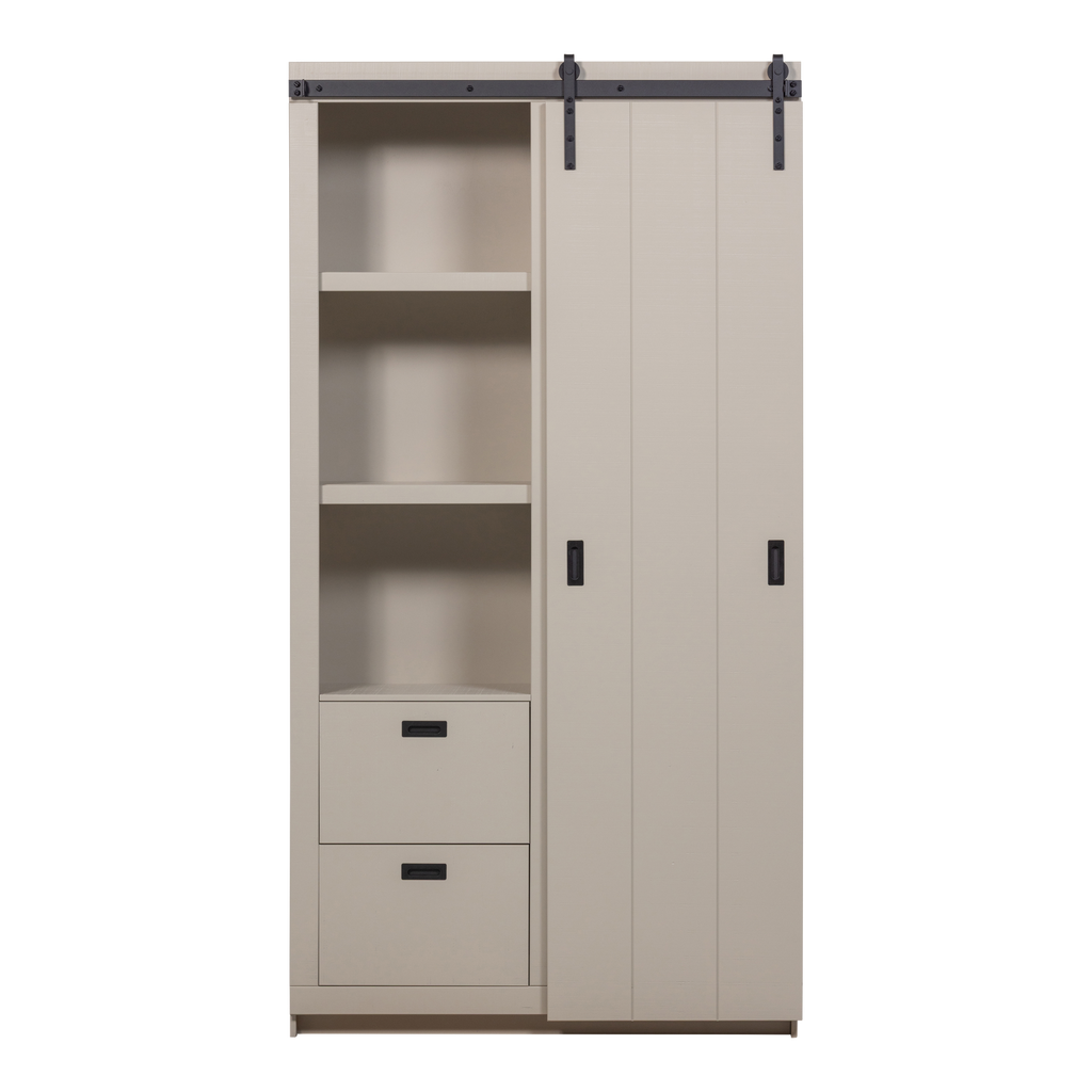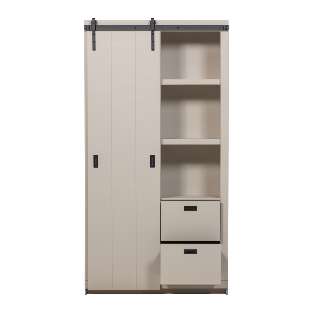 Denna modell har en skjutdörr design som inte bara underlättar enkel åtkomst till dina tillhörigheter, men också sparar utrymme. Invändigt finner du en smart layout med fyra hyllor och två lådor, idealiska för att organisera dina saker.