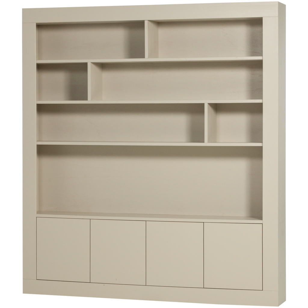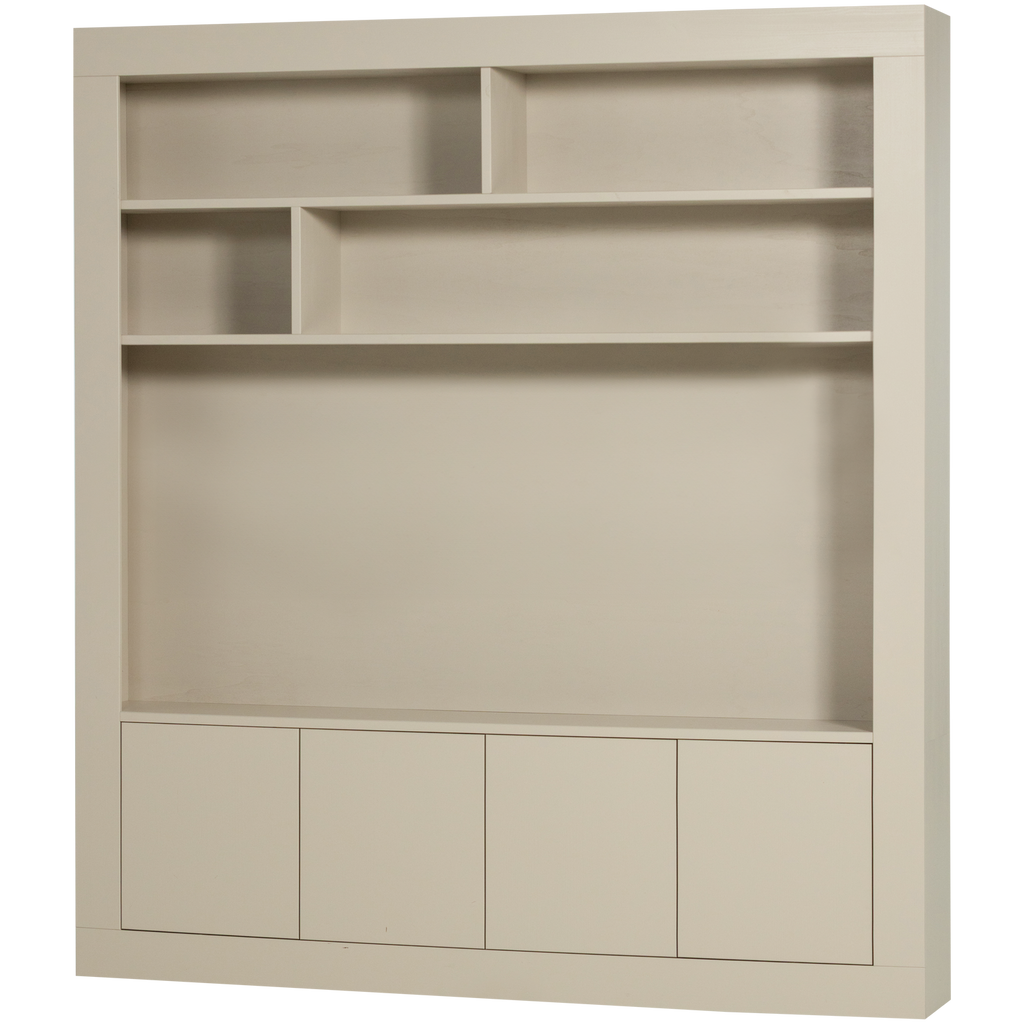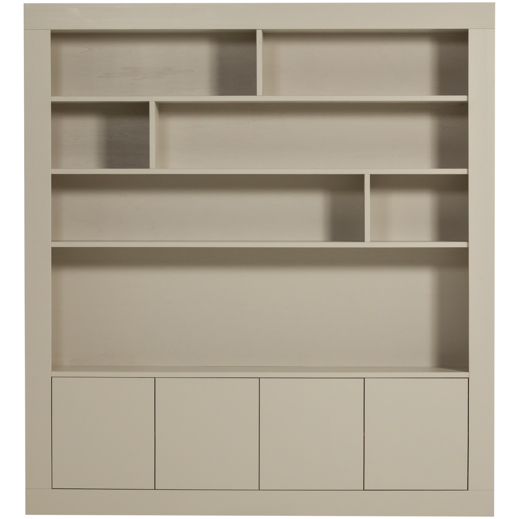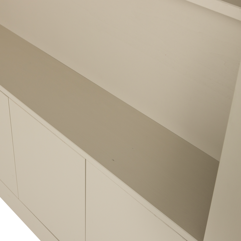 Detta väggskåp har en stilren design med öppna hyllor och diskreta dörrar som ger både exponeringsmöjligheter och dold förvaring. Materialet i furu är noggrant slipat för en mjuk finish, vilket gör skåpet behagligt att se på och röra vid.
