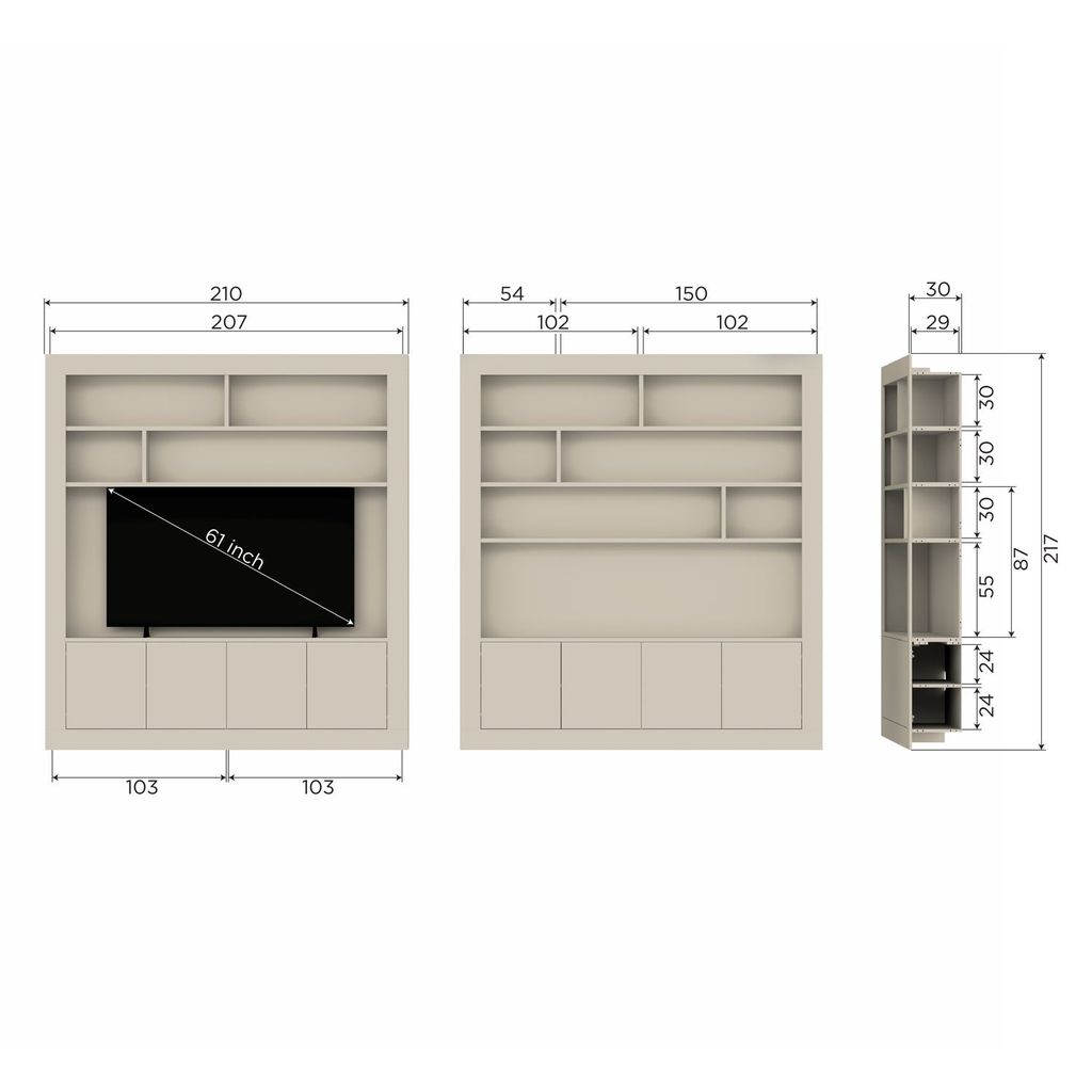 Med en generös storlek på H229 x B210 x D31 cm erbjuder skåpet gott om plats för att organisera och visa upp dina favoritföremål. De justerbara hyllorna klarar av att bära upp till 30 kg, vilket gör dem perfekta för både böcker och dekorativa objekt.